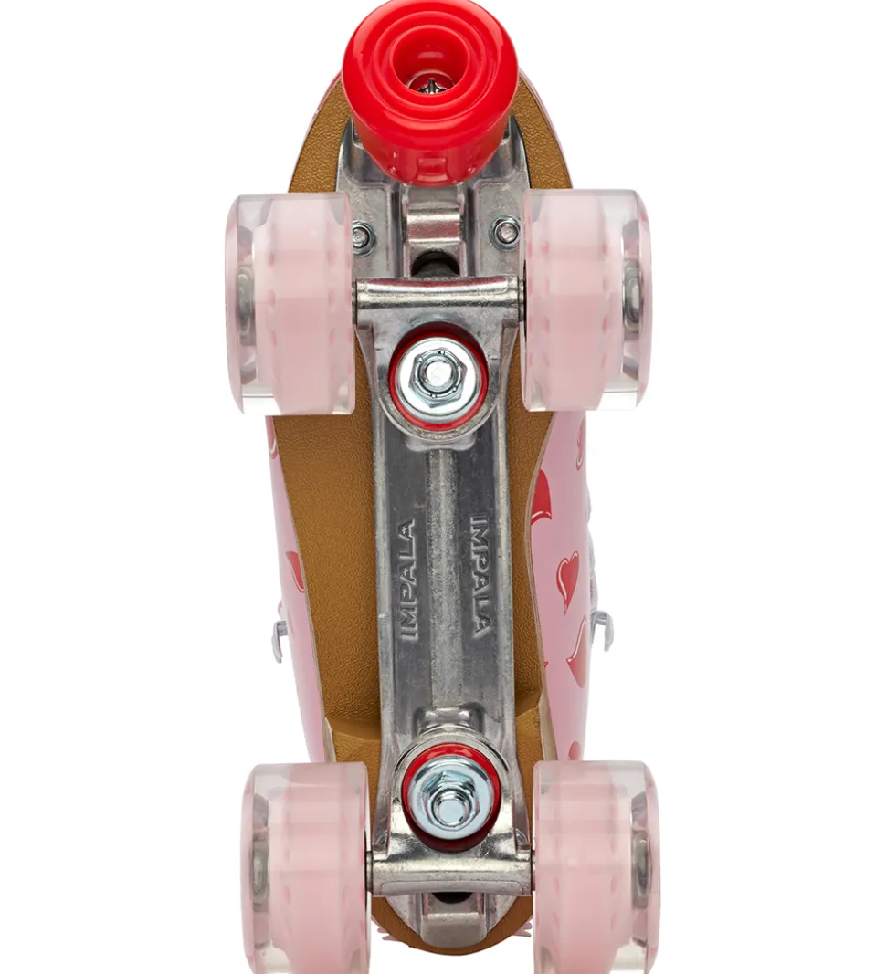 Yndige Impala rulleskøjter i rosa, med print af røde hjerter over det hele.
