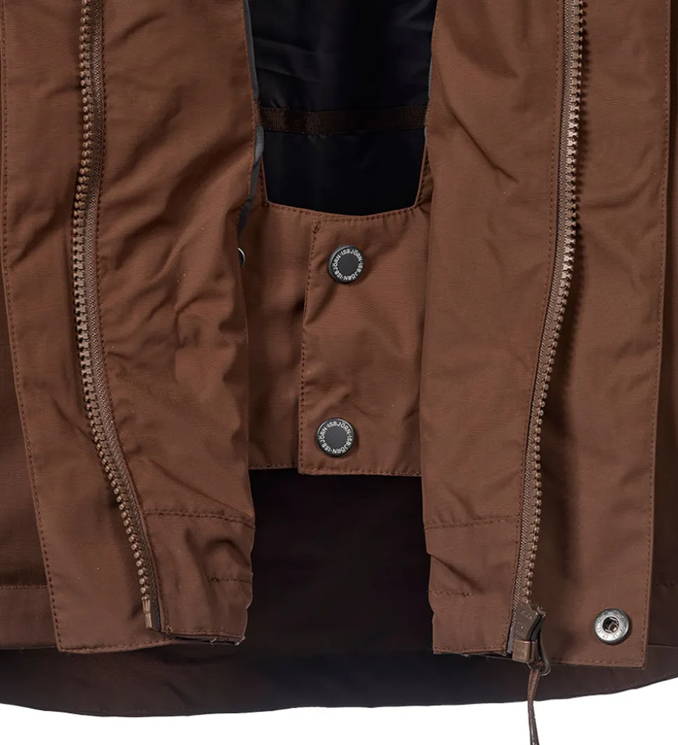 Flot Isbjörn Of Sweden skaljakke i brun. Skaljakken har logoprint på venstre bryst og hætten samt smarte refleksprint på lænden og begge skuldre.