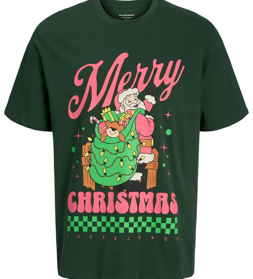 Festlig Jack & Jones t-shirt i mørkegrøn. T-shirten prydes af et farverigt juleprint med teksten “Merry Christmas” i rød. Illustrationen viser en julesæk fyldt med gaver og en glad julemand. Nederst er der et ternet mønster i grønne nuancer, samt Jack & Jones navnet i bunden.