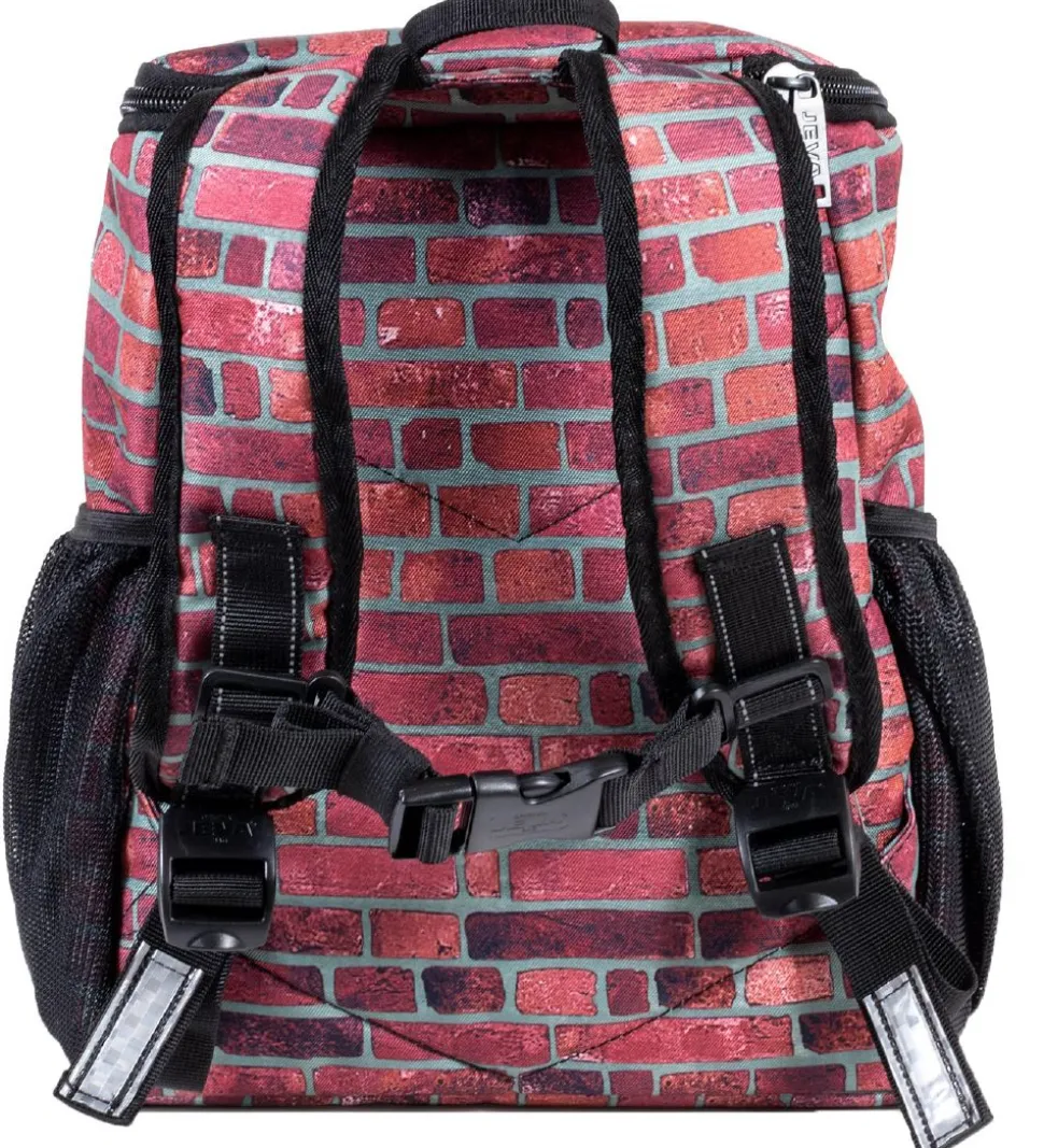 Skøn Jeva børnehavetaske med murstensprint med en grøn dinosaur på fronten og sorte lynlåse.
