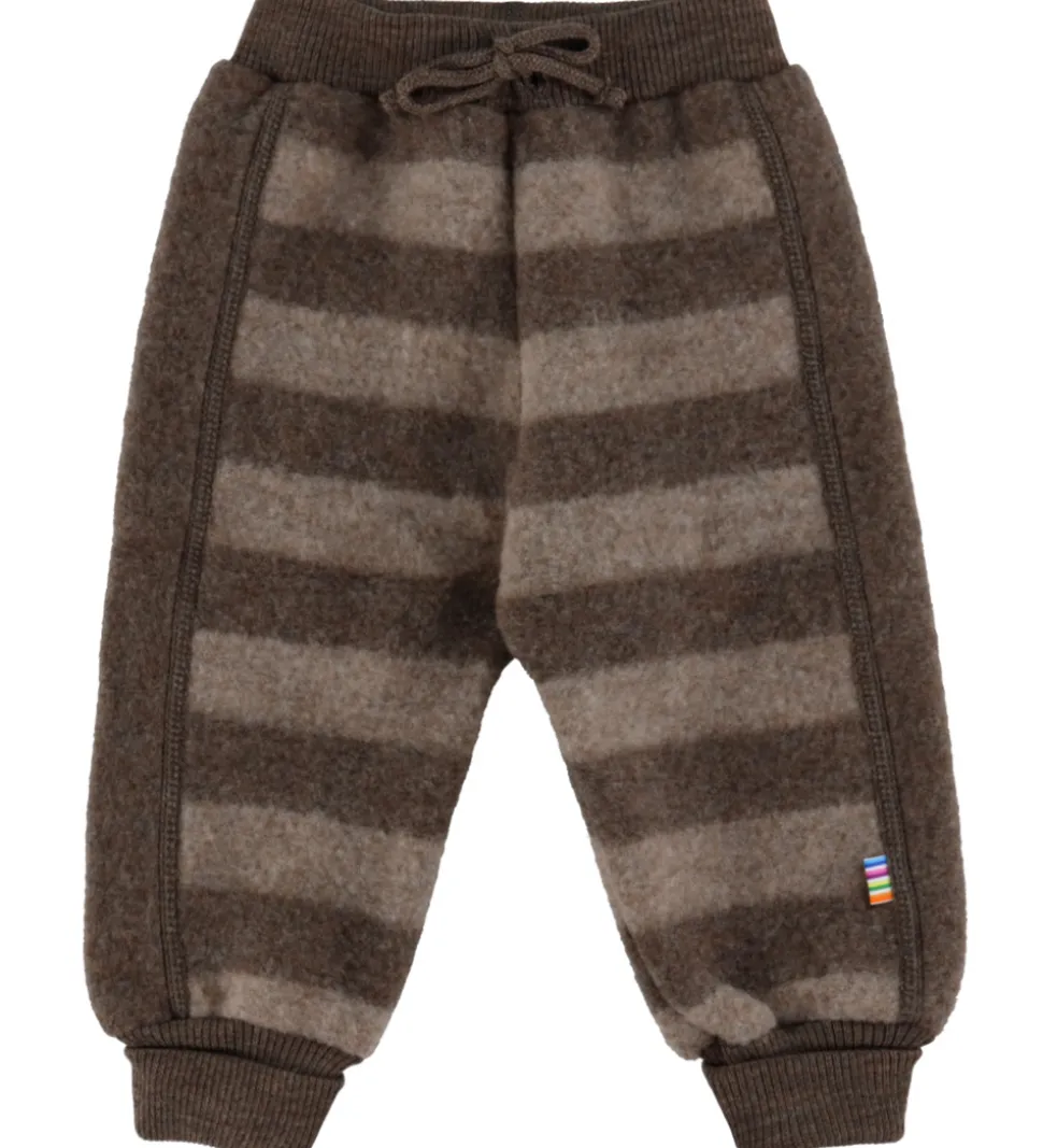 Komfortable Joha bukser med stribet design i brune nuancer. Joha bukserne har elastik i taljen og dekorative snører foran. De har en behagelig pasform med brede ribknater ved anklerne. Bukserne er fremstillet i en kraftig kvalitet i blødt merinould.