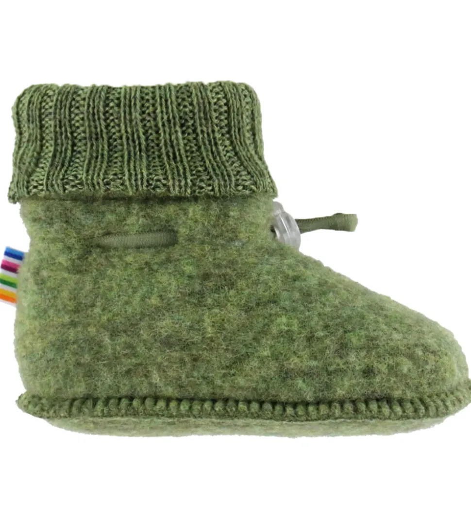 Behagelige Joha futter i en flot, olievngrøn nuance. Joha futterne har en strikket, ombukket ribkant for en god pasform og praktiske elastiksnører, der sikrer, at futterne sidder godt på foden. Perfekte til at holde de små fødder varme.