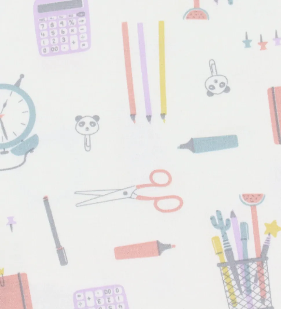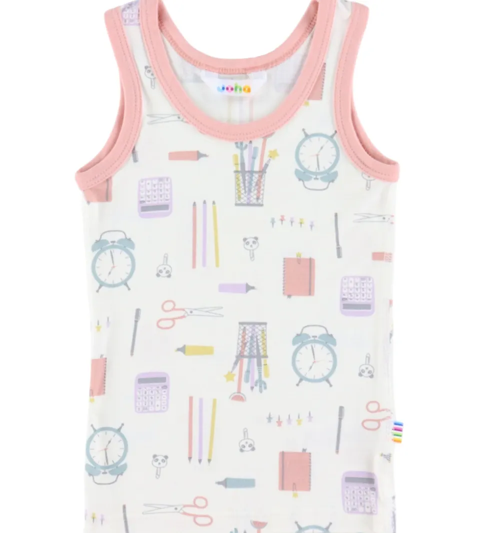 Flot Joha undertrøje i hvid med print af skole-motiver i forskellige farver. Undertrøjen har brede skulderstropper og en rund halsudskæring. Den er fremstillet af bambus viskose og lycra.