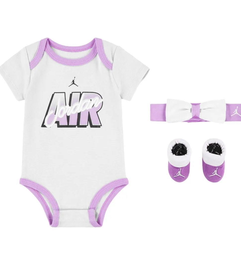 Sød Jordan gaveæske bestående af en body, en pandebånd og et par sokker. Bodyen er rosa med et stort logo fortil i lilla, sort og hvid, og bodyen har en lilla kanter. Pandebåndet er lilla med en rosa sløjfe fortil samt et lille logo i hvid. Sokkerne er lilla med rosa kanter og et hvidt, broderet logo fortil.