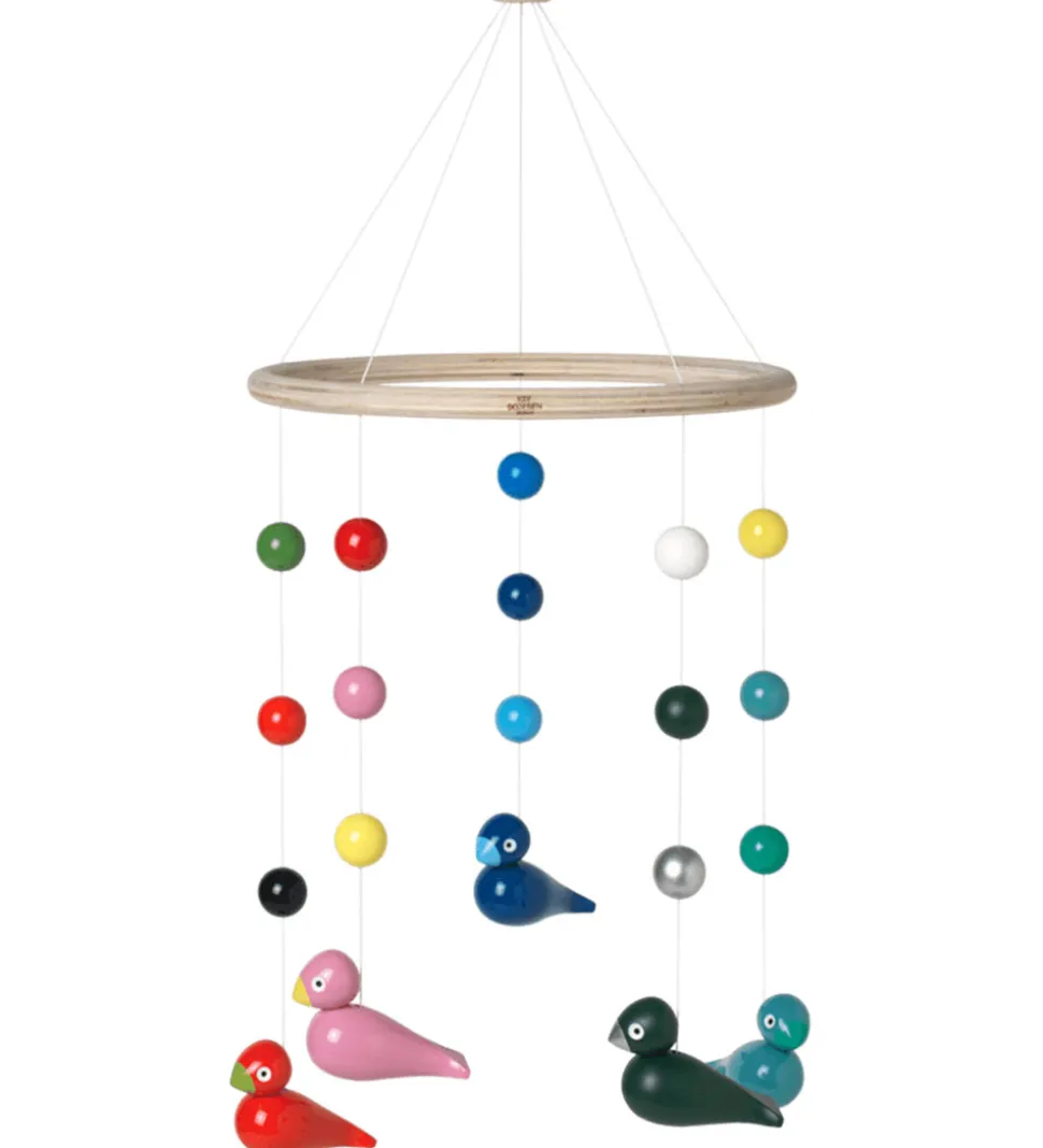 Flot Kay Bojesen uro af træ med farverige vedhæng formet som de kendte sangfugle fra Kay Bojesen.