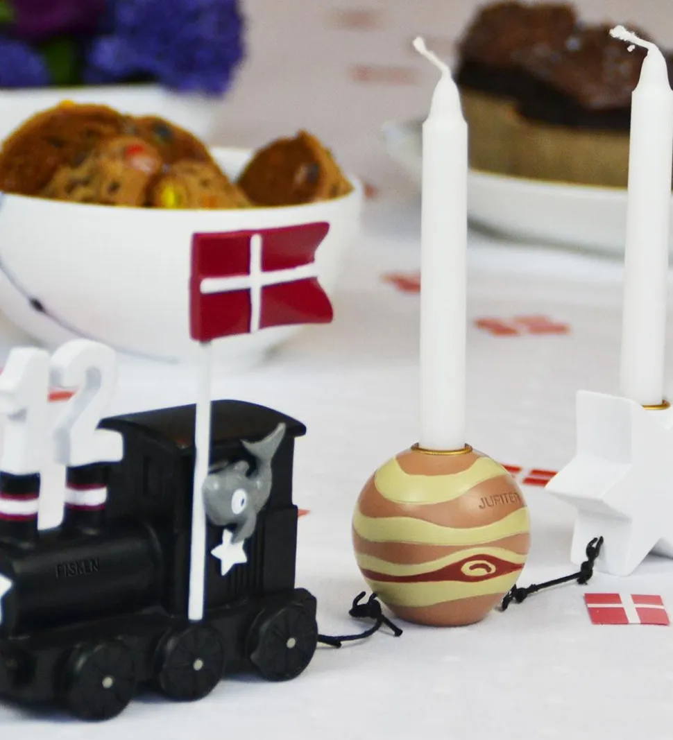 Fødselsdagstogets har plads til to stearinlys i stjernen og planeten, imens tallene og flaget skal placeres på selve fødselsdagstoget.