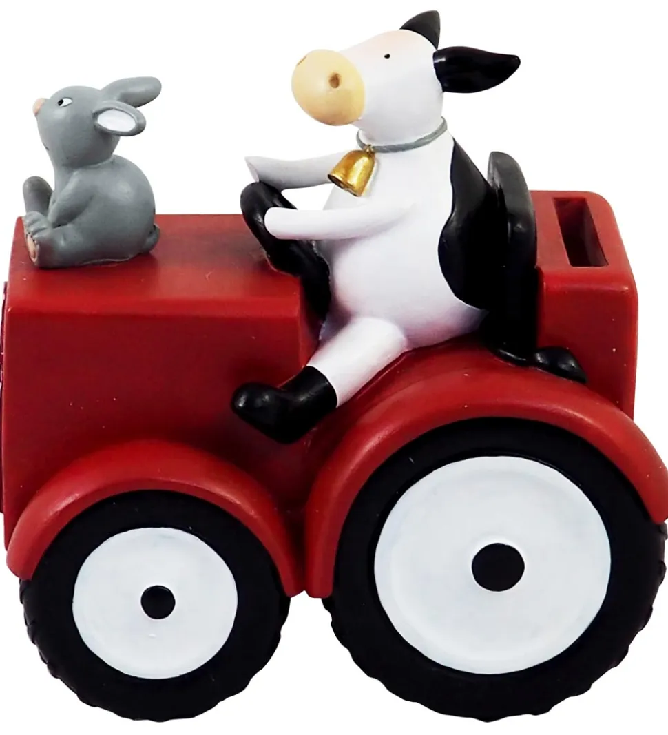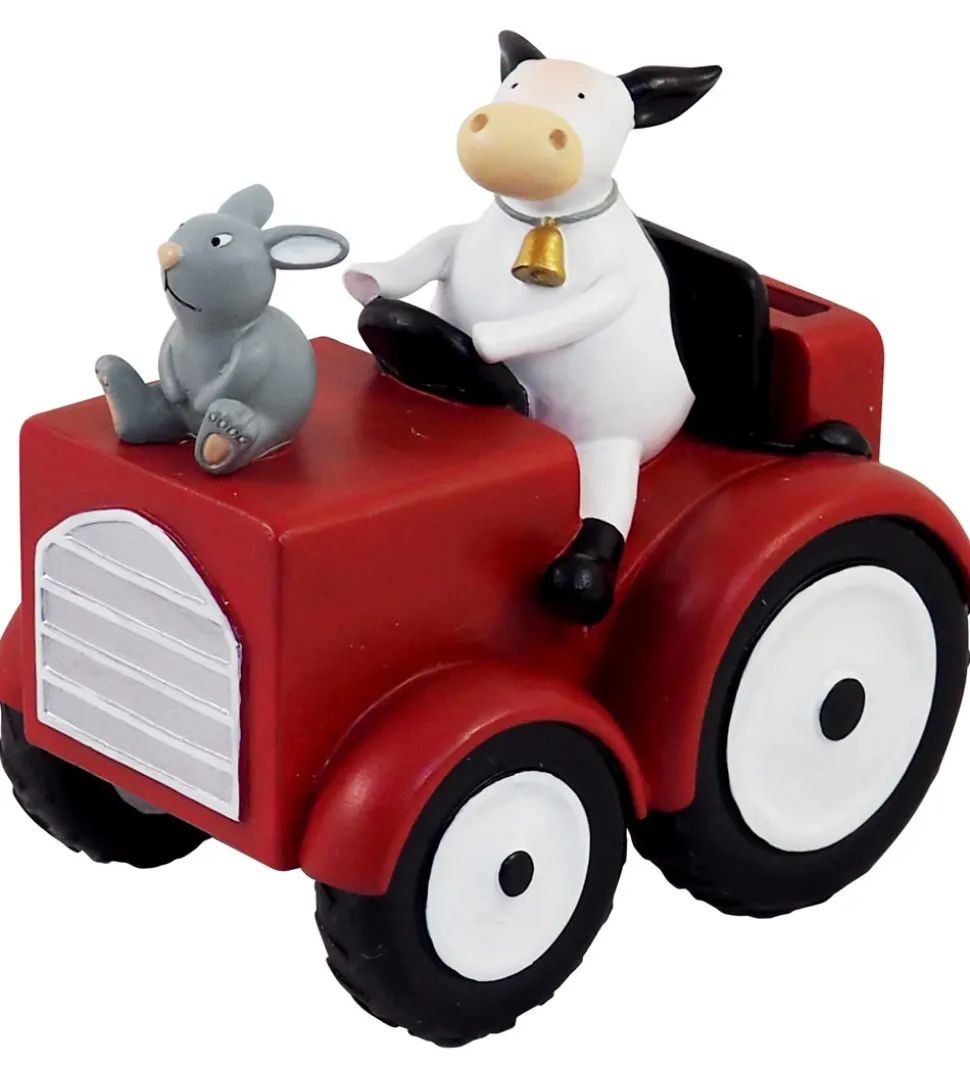 Flot Kids by Friis sparebøsse med bondegårdstema. Sparbøssen forestiller en rød traktor der bliver kørt af en ko, og som har en mus som passager foran.
