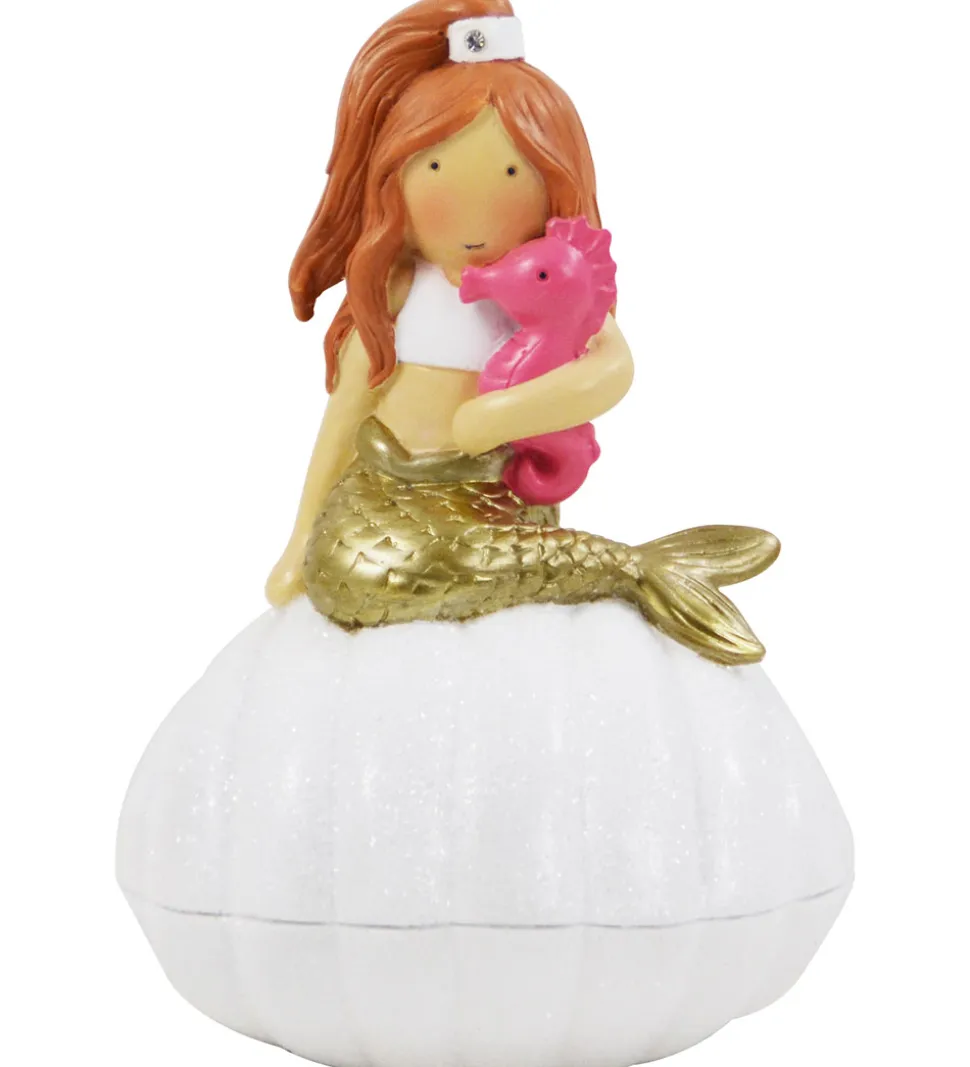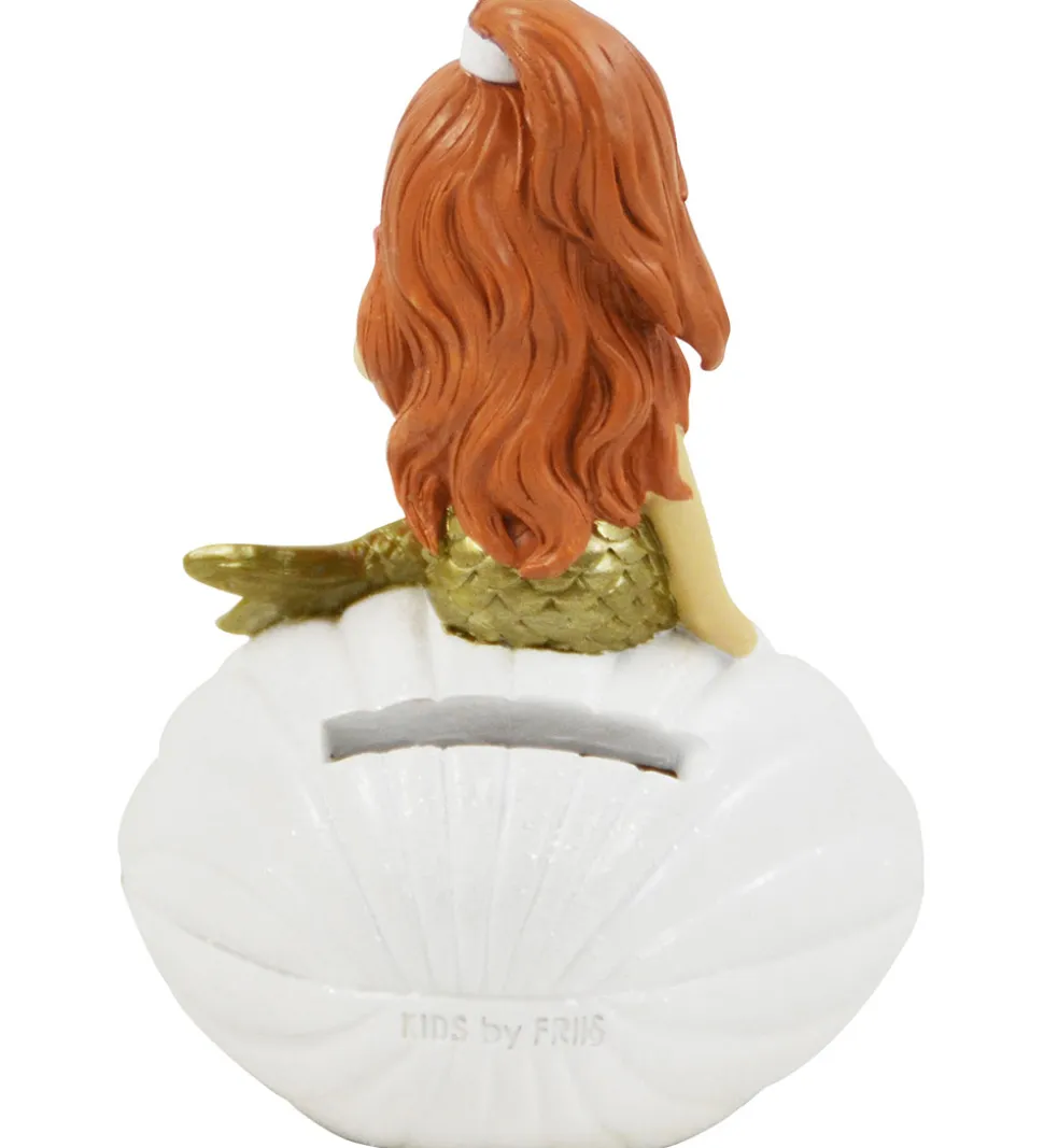 Super flot Kids by Friis sparebøsse med H.C. Andersens eventyr “Den Lille Havfrue” som tema. Sparebøssen forestiller en stor, hvid muslingeskal med en sød havfrue med en guld halle på toppen med en rosa søhest i armene.