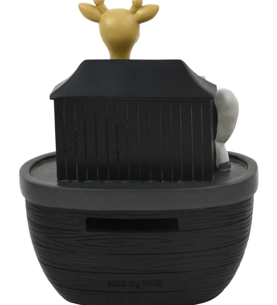 Super flot Kids by Friis sparebøsse med “Noah’s Ark” som tema. Sparebøssen forestiller en stor, brun båd med en lille grå elefant, en gul giraf og en brun abe.