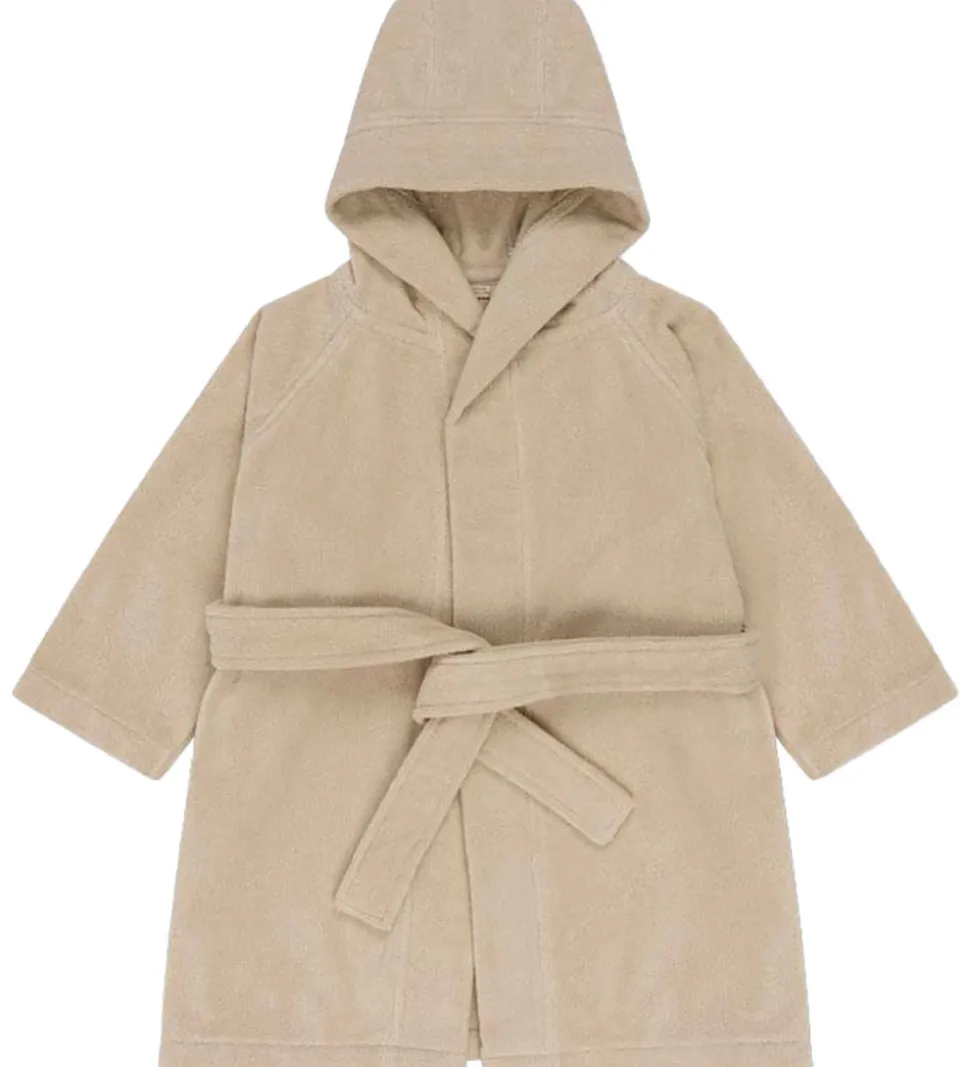 Flot Konges Sløjd badekåbe i en beige farve med en stor citron samt teksten “squeeze me” broderet på ryggen.