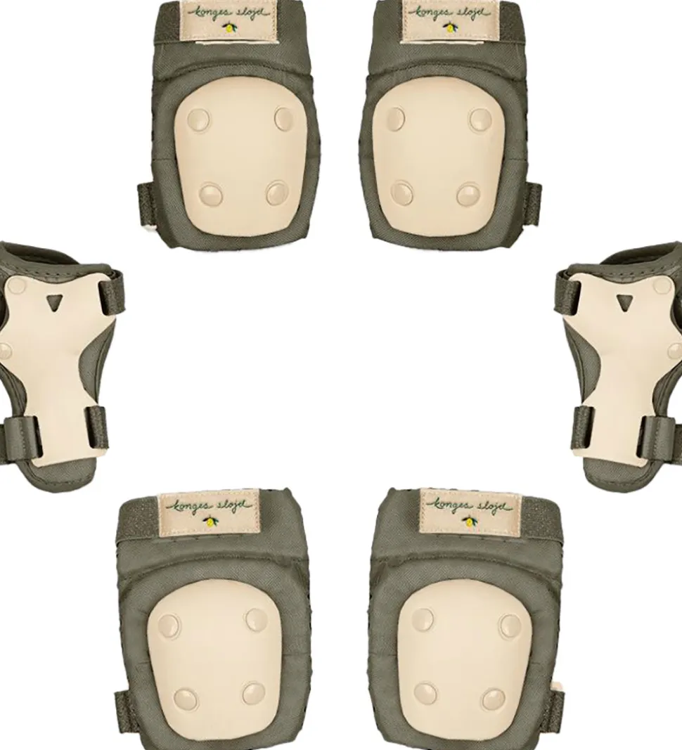 Konges Sløjd beskyttelsessættet beskytter de udsatte områder på barnet, når barnet er ude at stå på rulleskøjter, løbehjul, skateboard eller køre på løbecykel. Benet eller armen føres ned gennem åbningen, og så kan de forskellige dele spændes fast med brede elastikker med velcrolukning. Knæ- og albuebeskytterene har en bagside af blødt polyester, så remmene ikke irriterer huden.