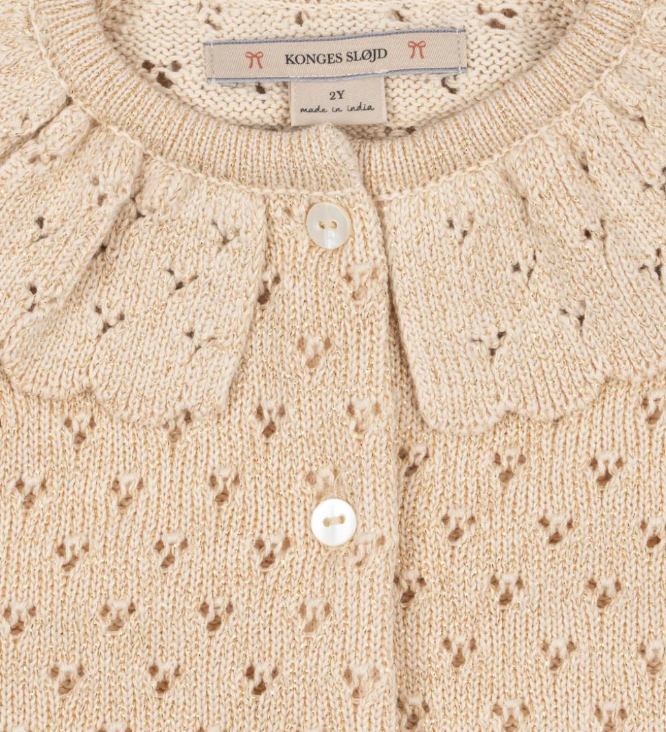 Yndig Konges Sløjd cardigan i en blød, beige nuance med glimmer og et fint hulmønster og, der giver et elegant udtryk.