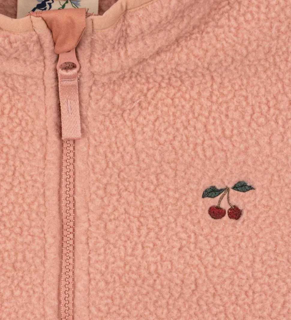 Flot Konges Sløjd fleecejakke i en sart, rosa nuance med et lille kirsebærbroderi på brystet. Fleecejakken er lavet af blødt teddyfleece, som giver en behagelig struktur.