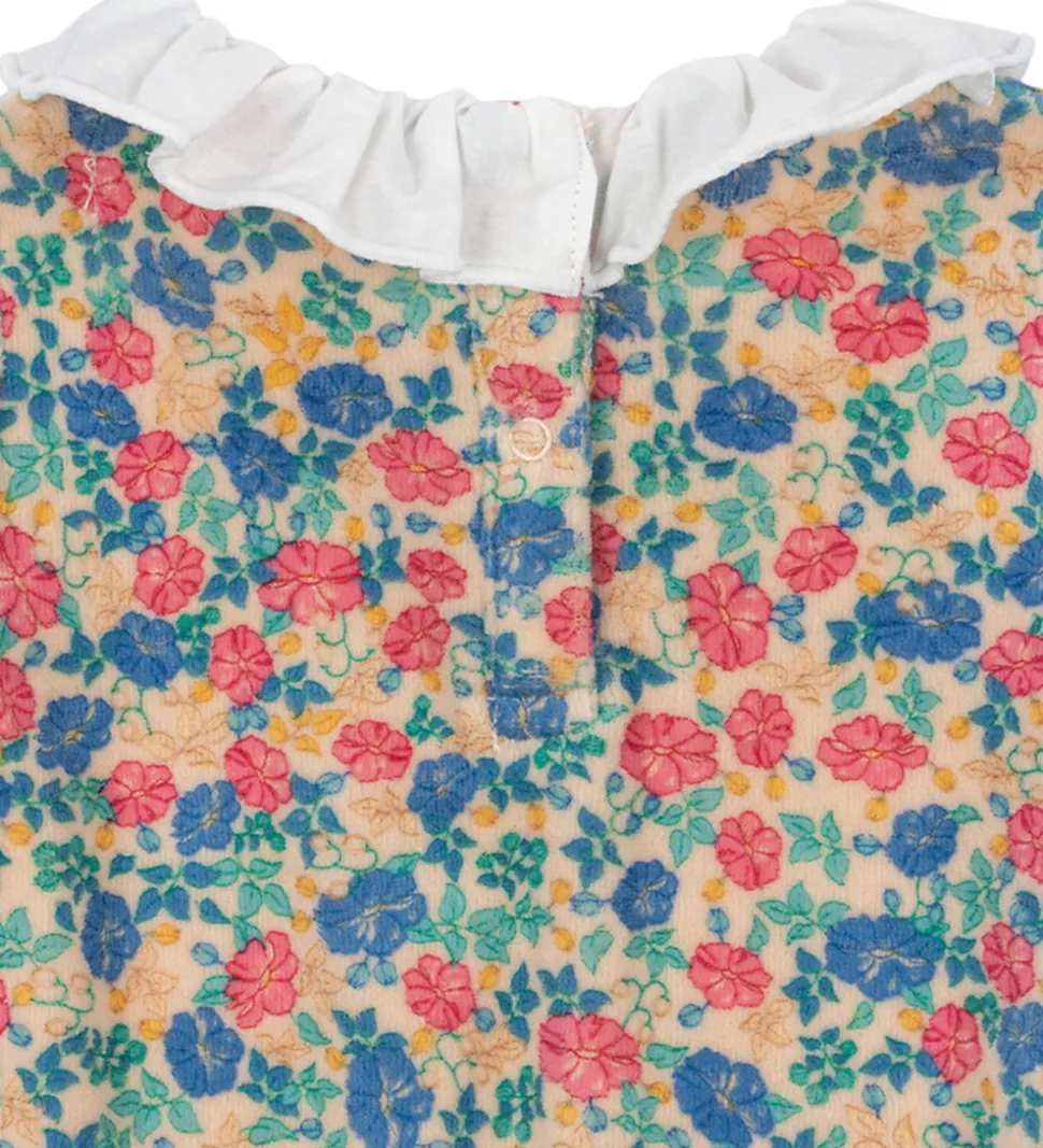 Smuk Konges Sløjd heldragt med frottéstruktur, og et farverigt blomsterprint i blå, rød og beige nuancer. Den bløde krave er hvid og giver et elegant udtryk.