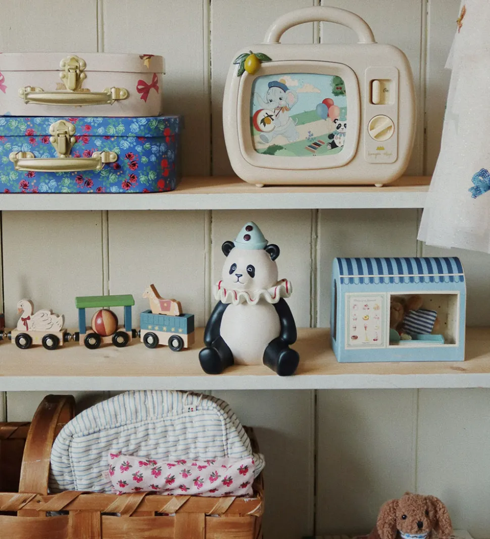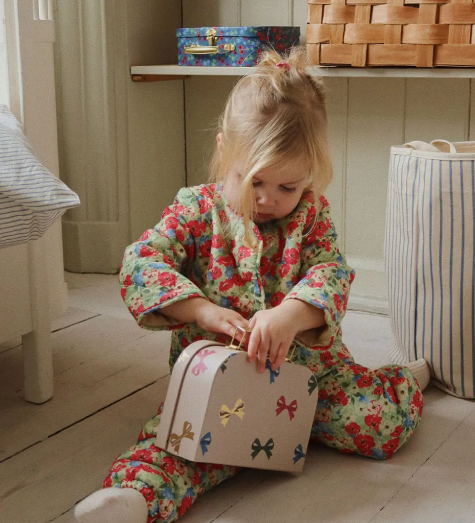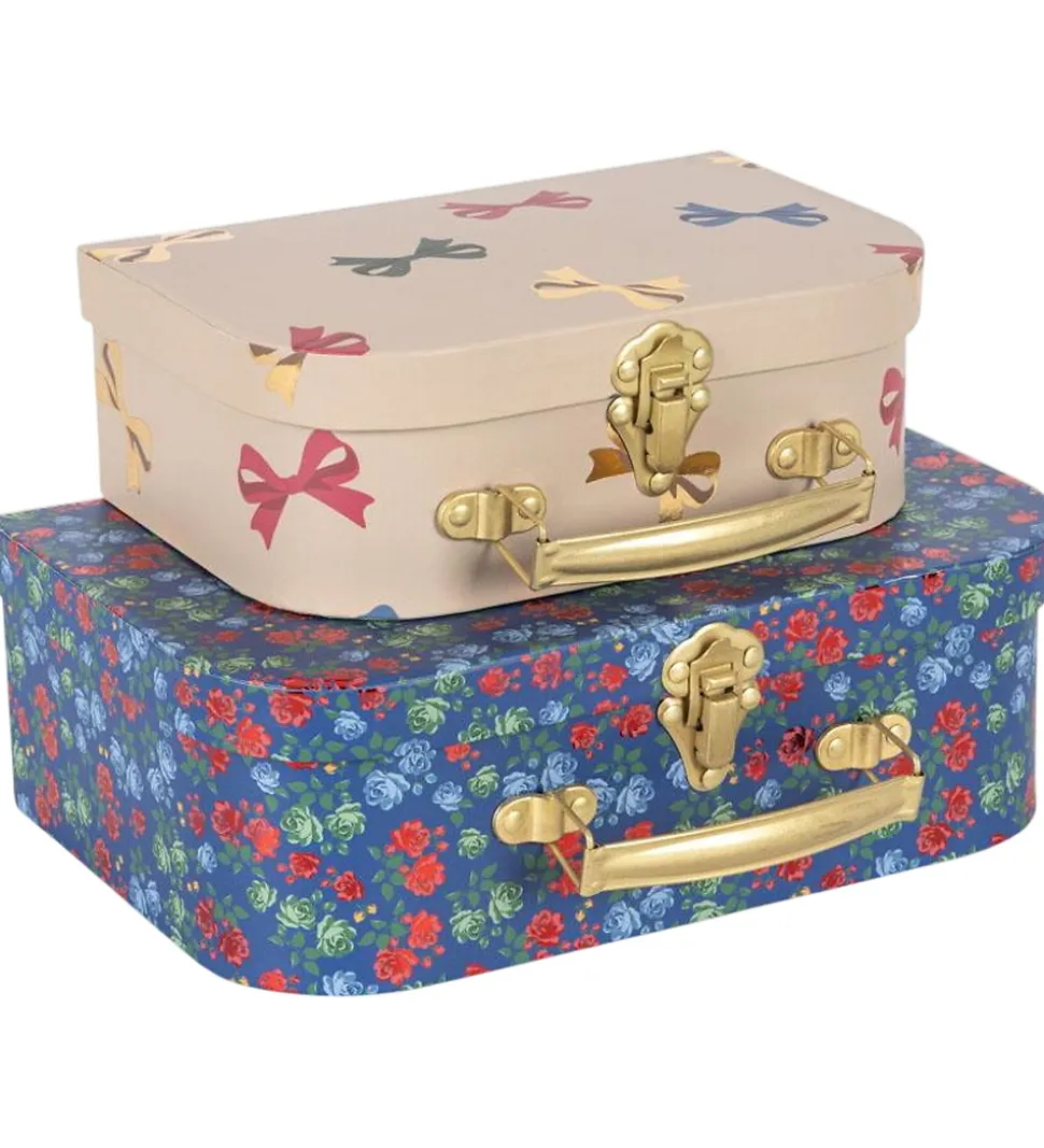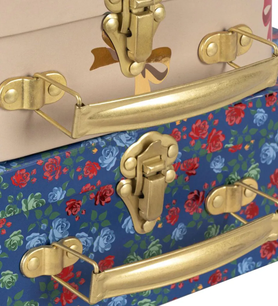 Konges Sløjd kuffertsættet består af to kufferter, som begge har et gyldent håndtag i toppen og åbnes med en metallås. Kufferterne er i tykt pap og er perfekte til opbevaring af f.eks. legetøj, eller når de små skal ud på tur. Den lille kuffert kan være inde i den store.