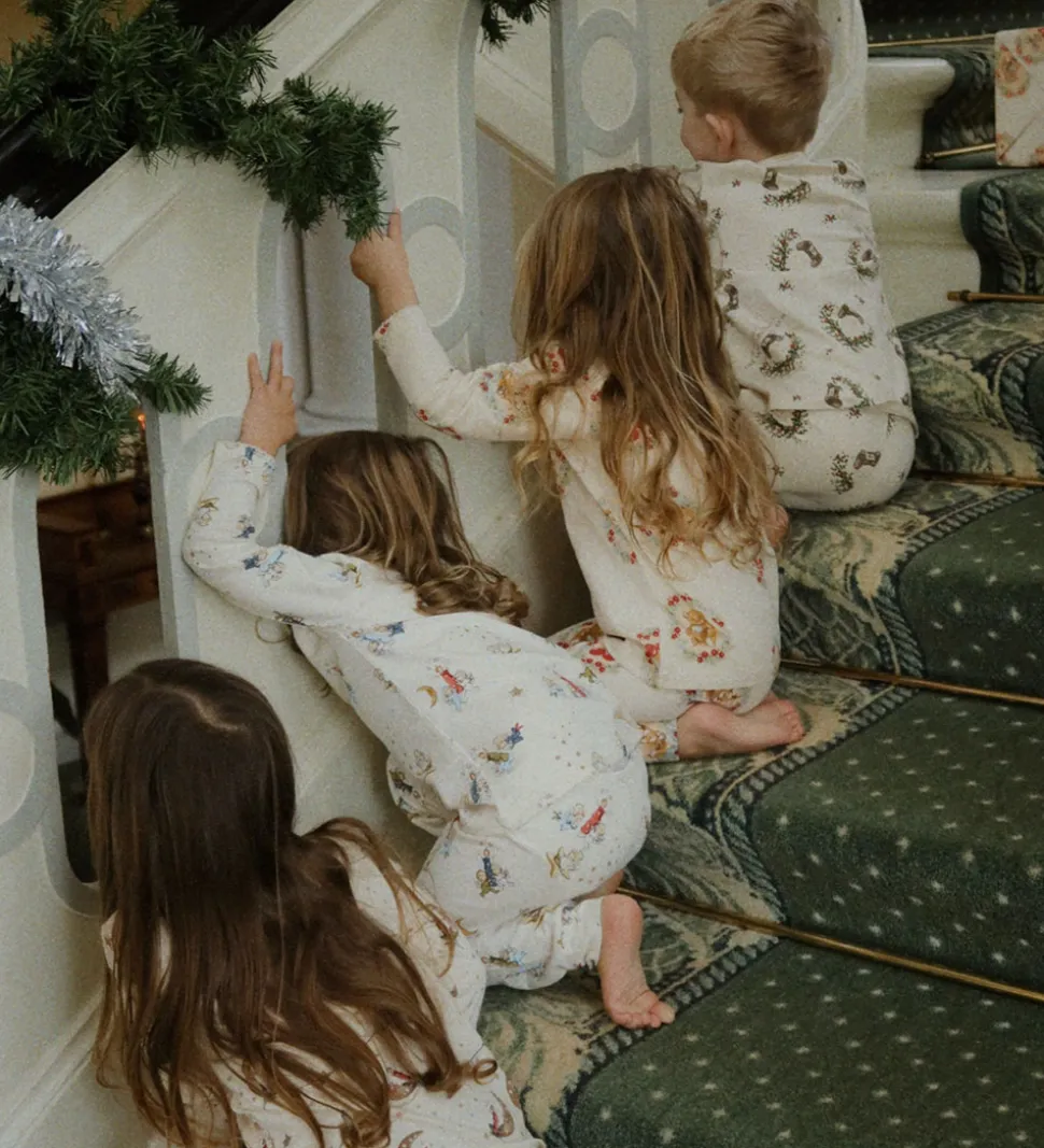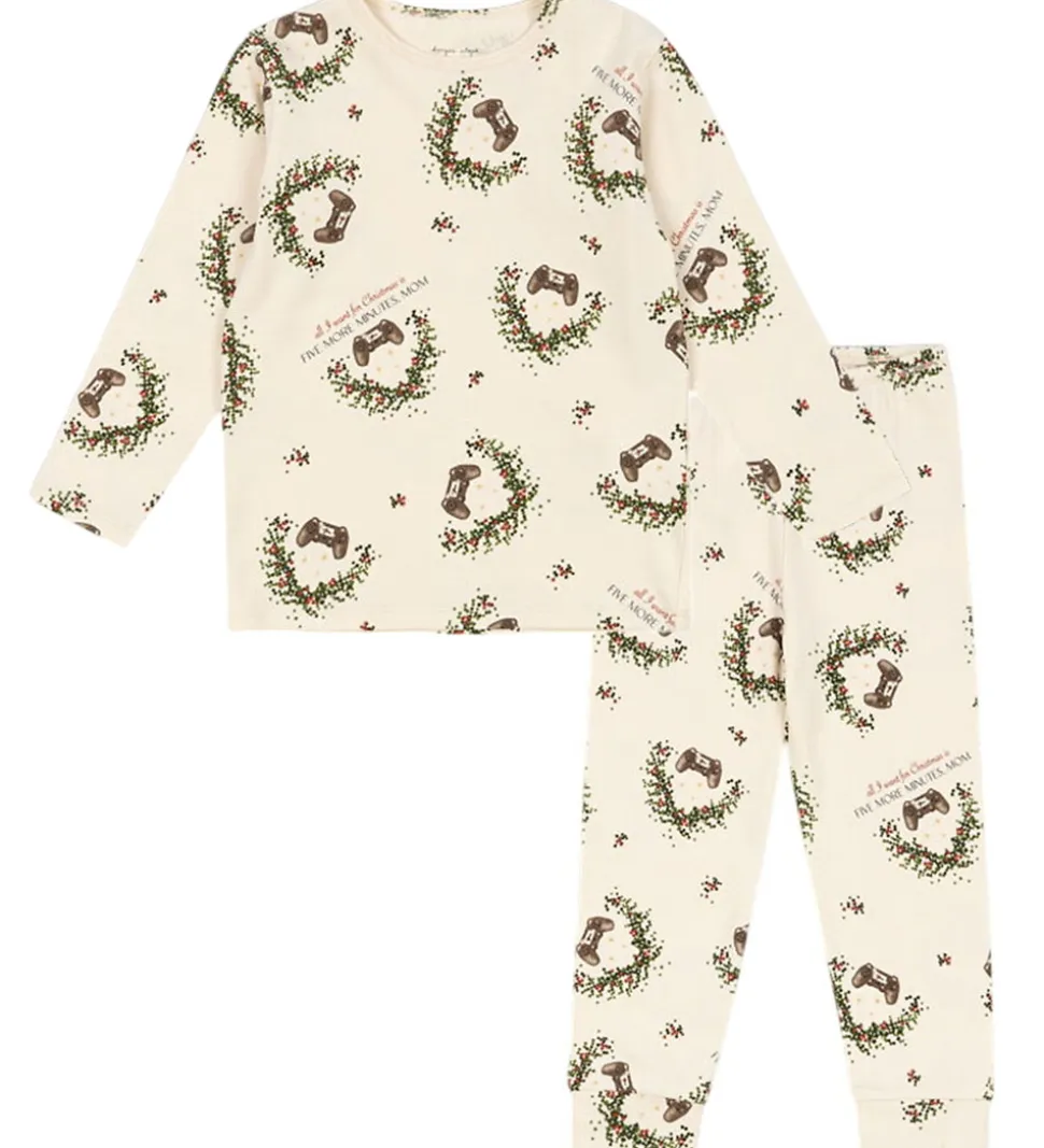 Charmerende Konges Sløjd nattøj bestående af en natbluse og et par natbukser i beige med et smart gamerprint i grønne og brune nuancer. Den langærmede natbluse og natbukserne er designet til komfort og stil og har et sammenhængende look.