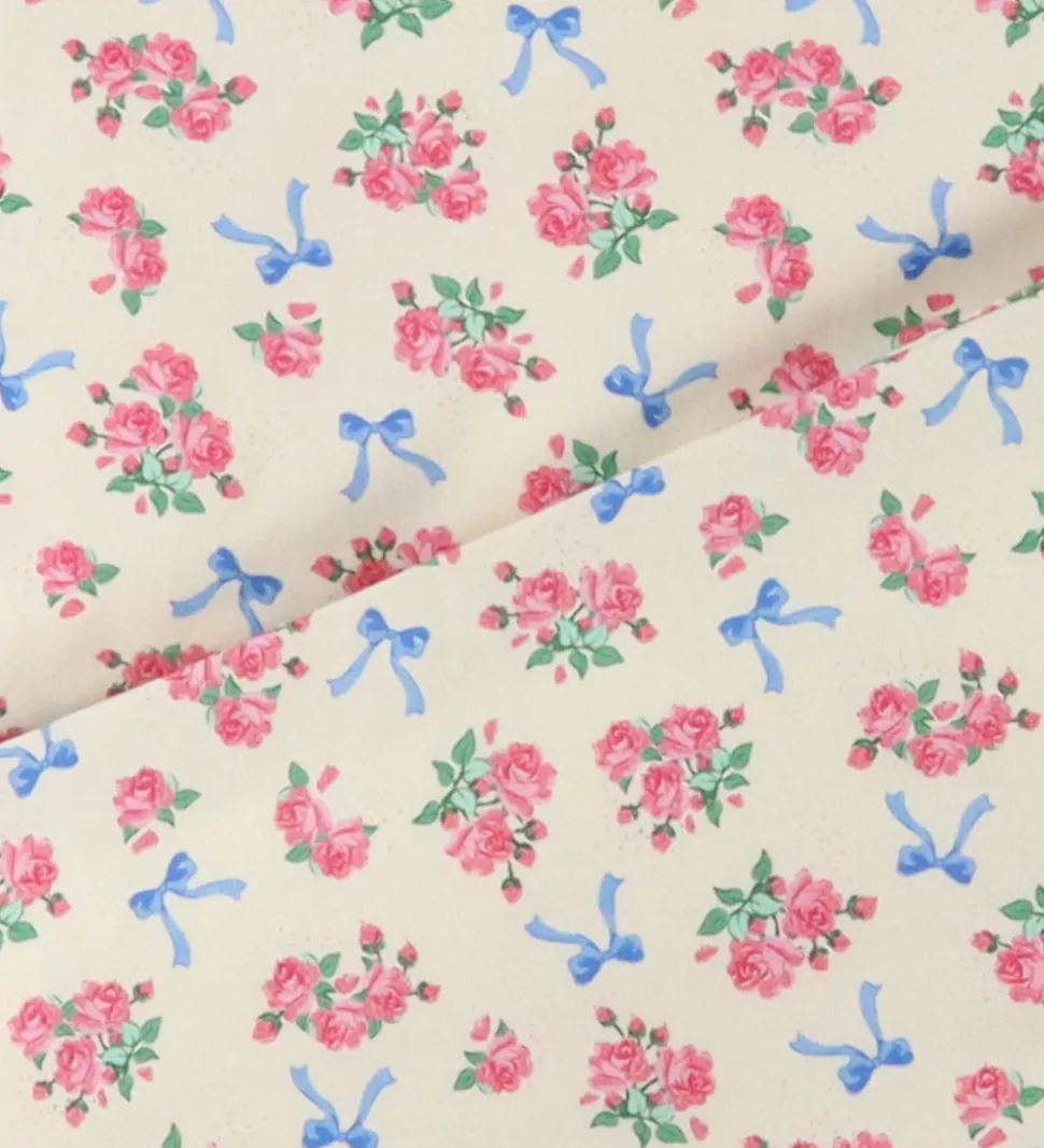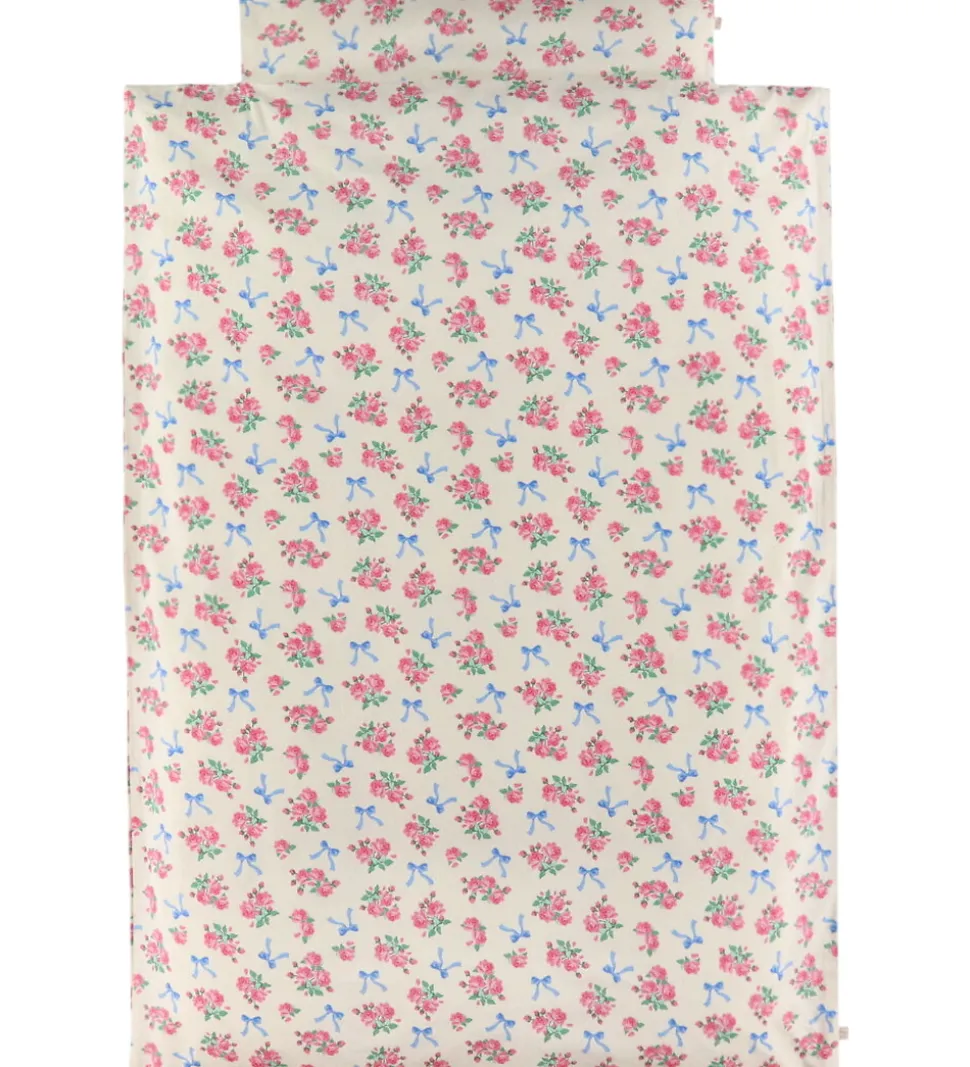 Sødt Konges Sløjd sengetøj i råhvid med print af blå sløjfer og blomster i pink og blå. Konges Sløjd sengetøjet består af et hovedpudebetræk med foldelukning, og et dynebetræk som lukkes med lynlås i enden. Sengetøjet er fremstillet i blødt, økologisk bomuld, og kommer i en smart opbevaringspose.