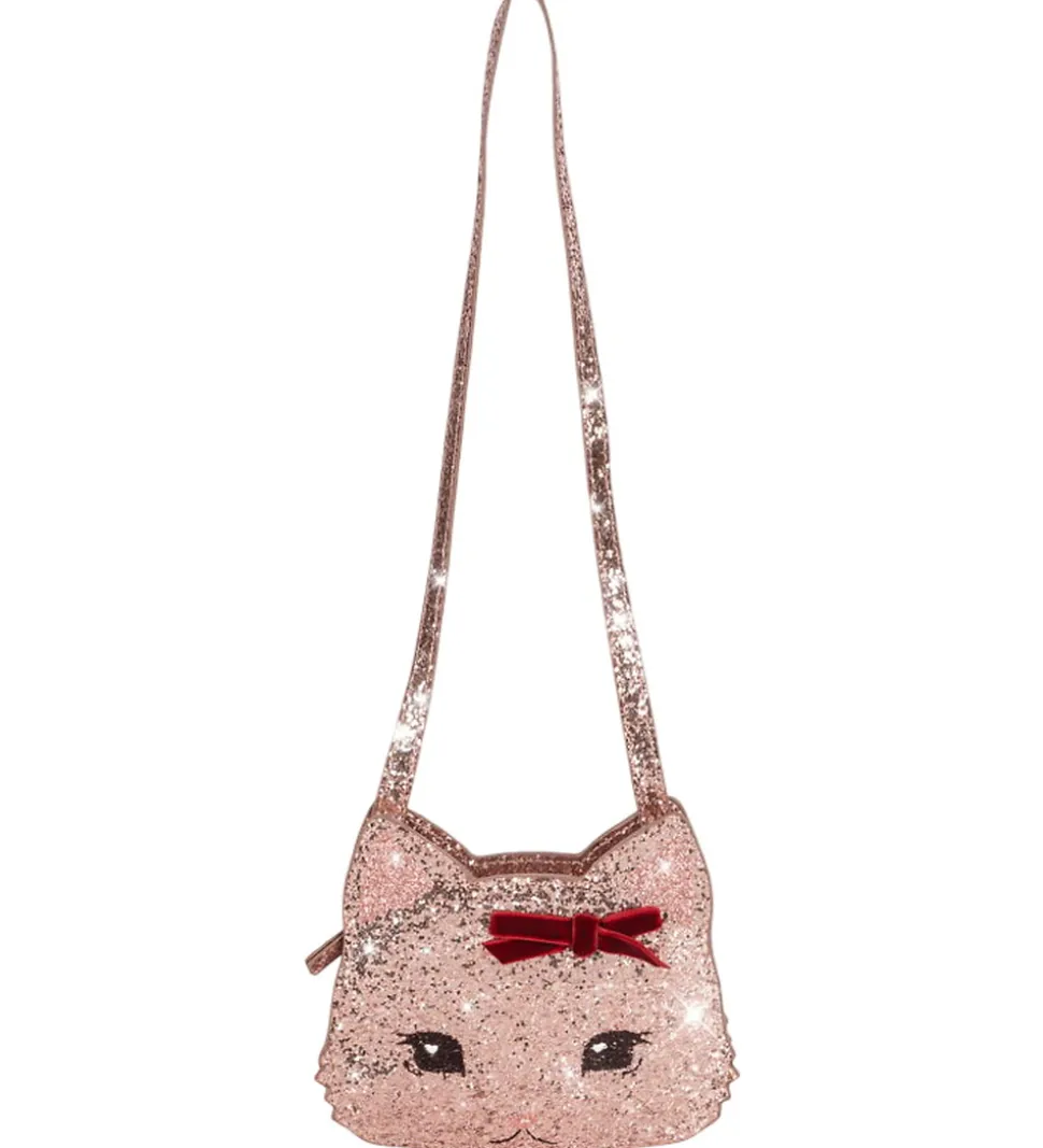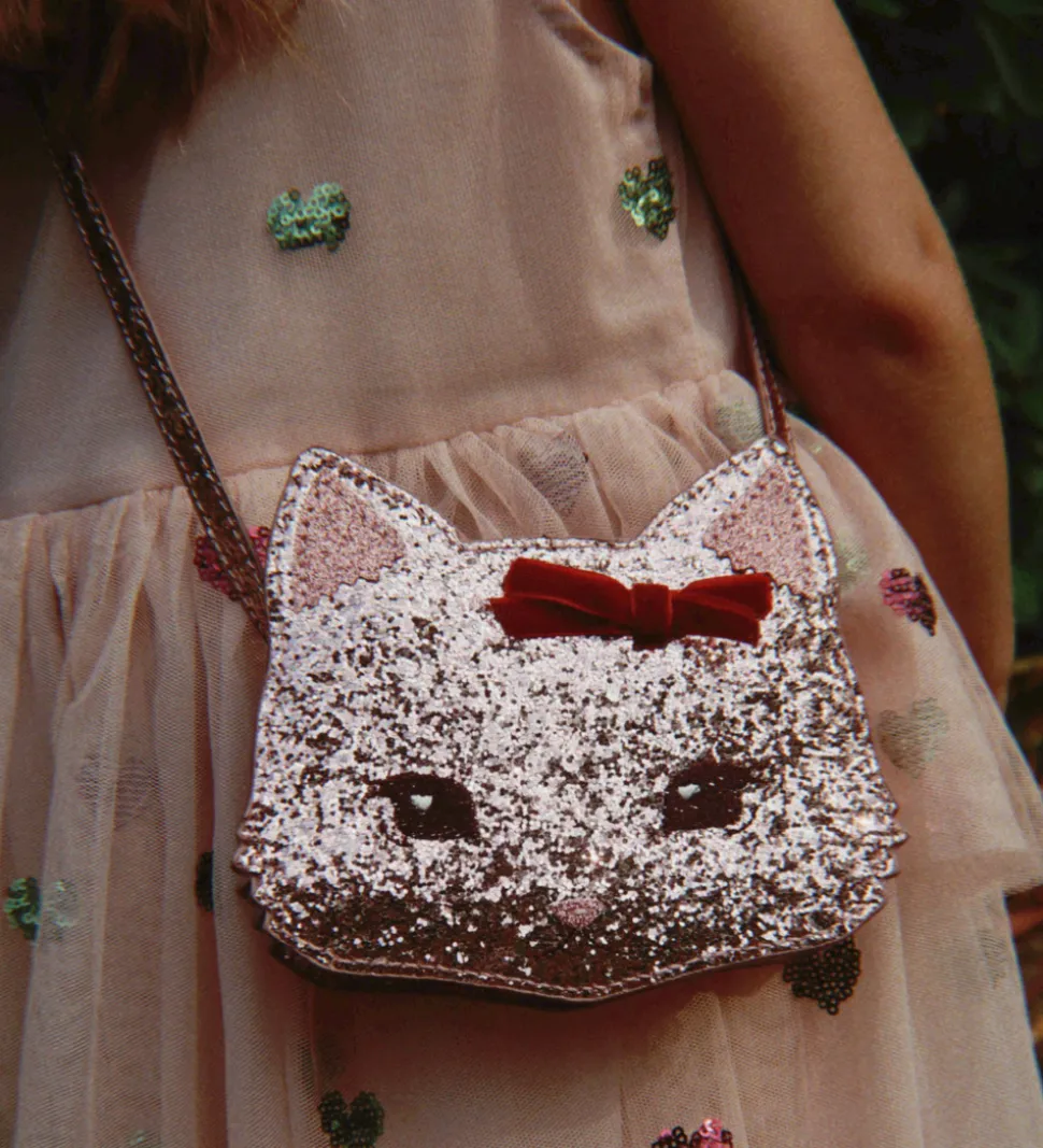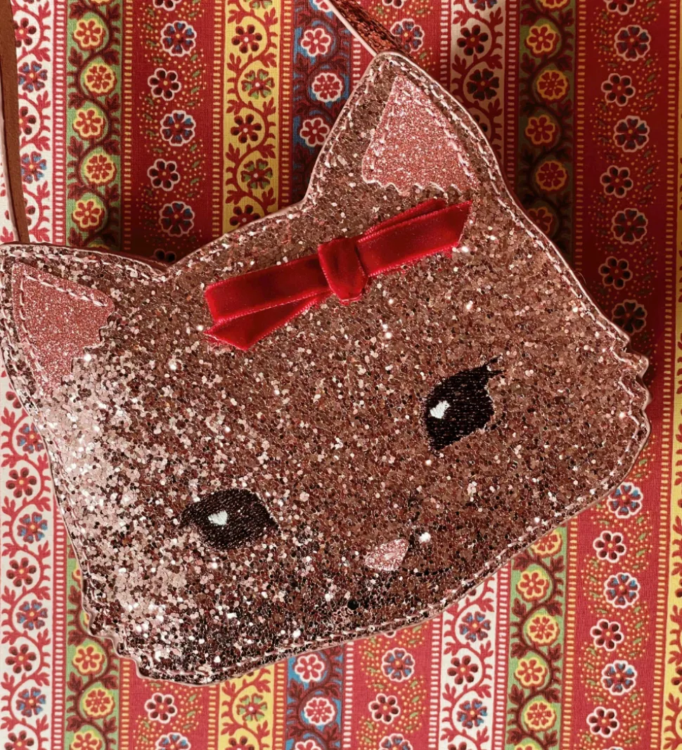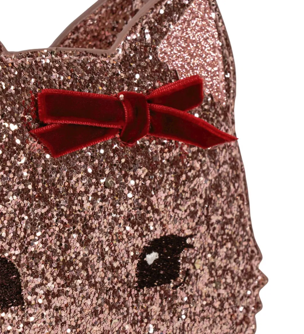 Charmerende Konges Sløjd skuldertaske i glitrende rosa med et sødt katteansigt. Tasken har en dekorativ rød sløjfe, der giver et ekstra flot udtryk. Perfekt til små skatte og eventyr.