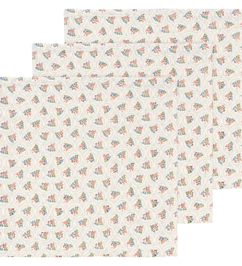 Søde Konges Sløjd stofbleer solgt i en 3-pak i hvid med et mønster af blå cirkler og blomster i rød, blå og grøn.