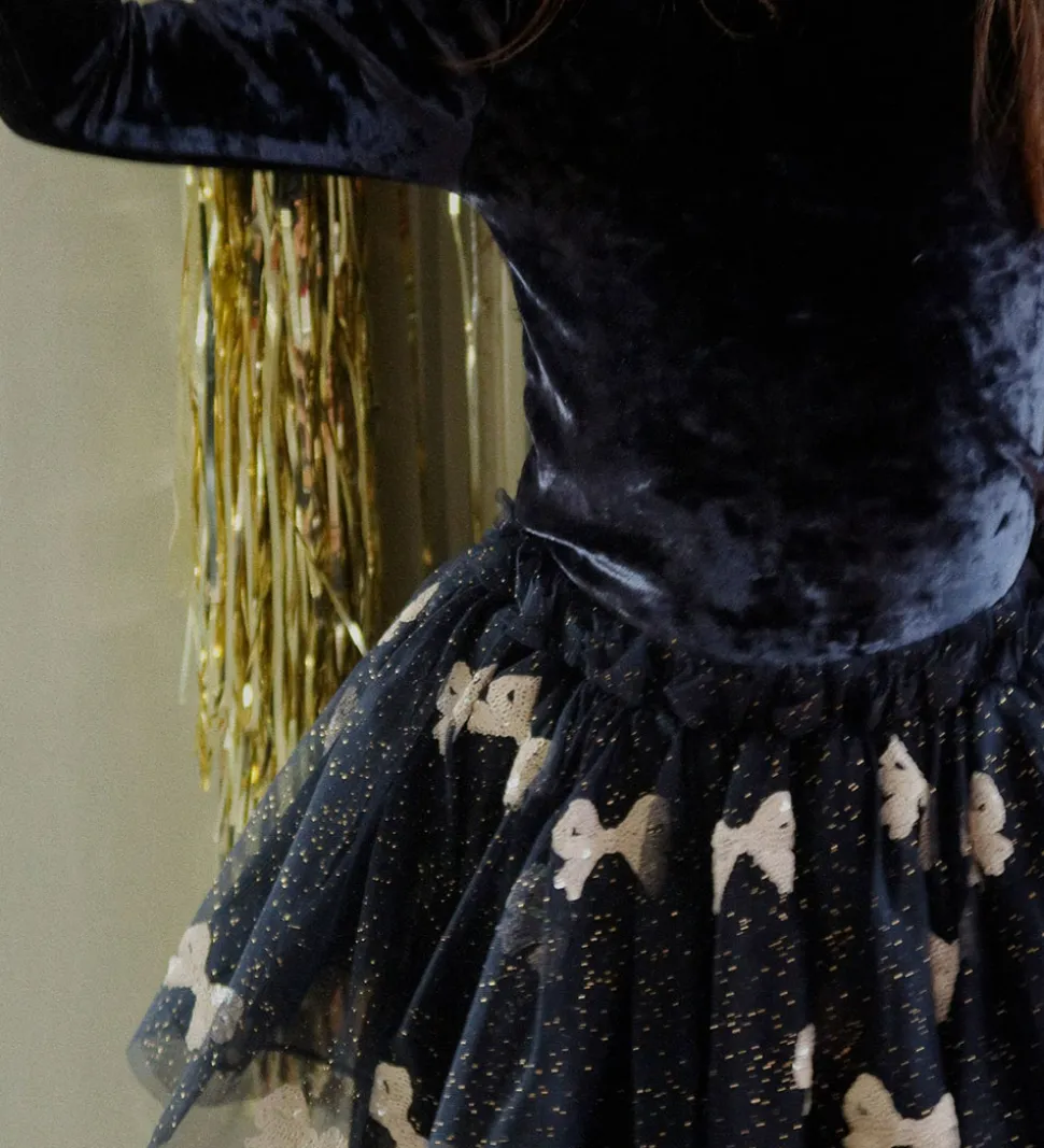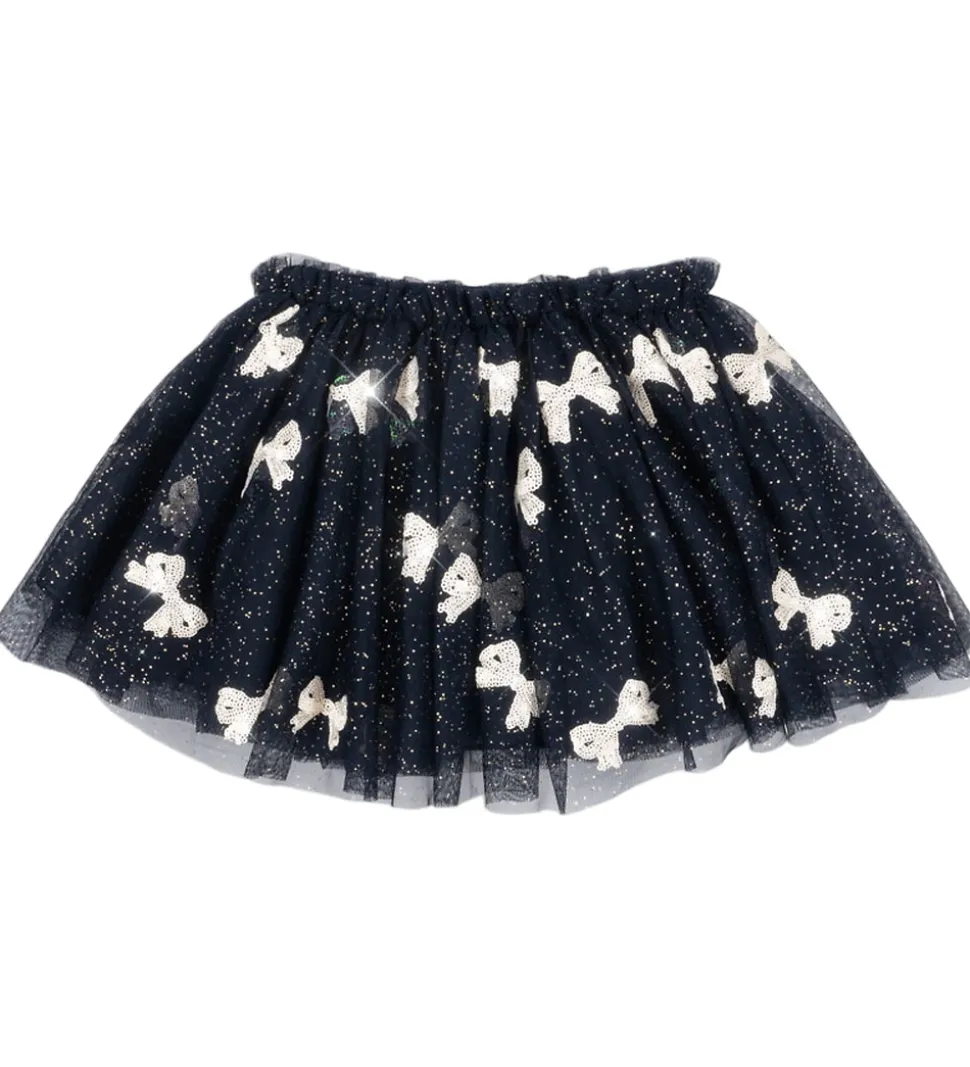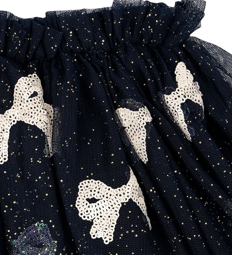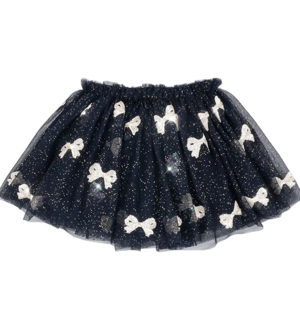 Elegant Konges Sløjd tylnederdel i navy med guldglimmer og pudderrosa sløjfer lavet af pailletter. Tylnederdelen har en smal elastikkant i livet, og nedenunder falder skørtet med massr af vidde. På indersiden har bomuld på.