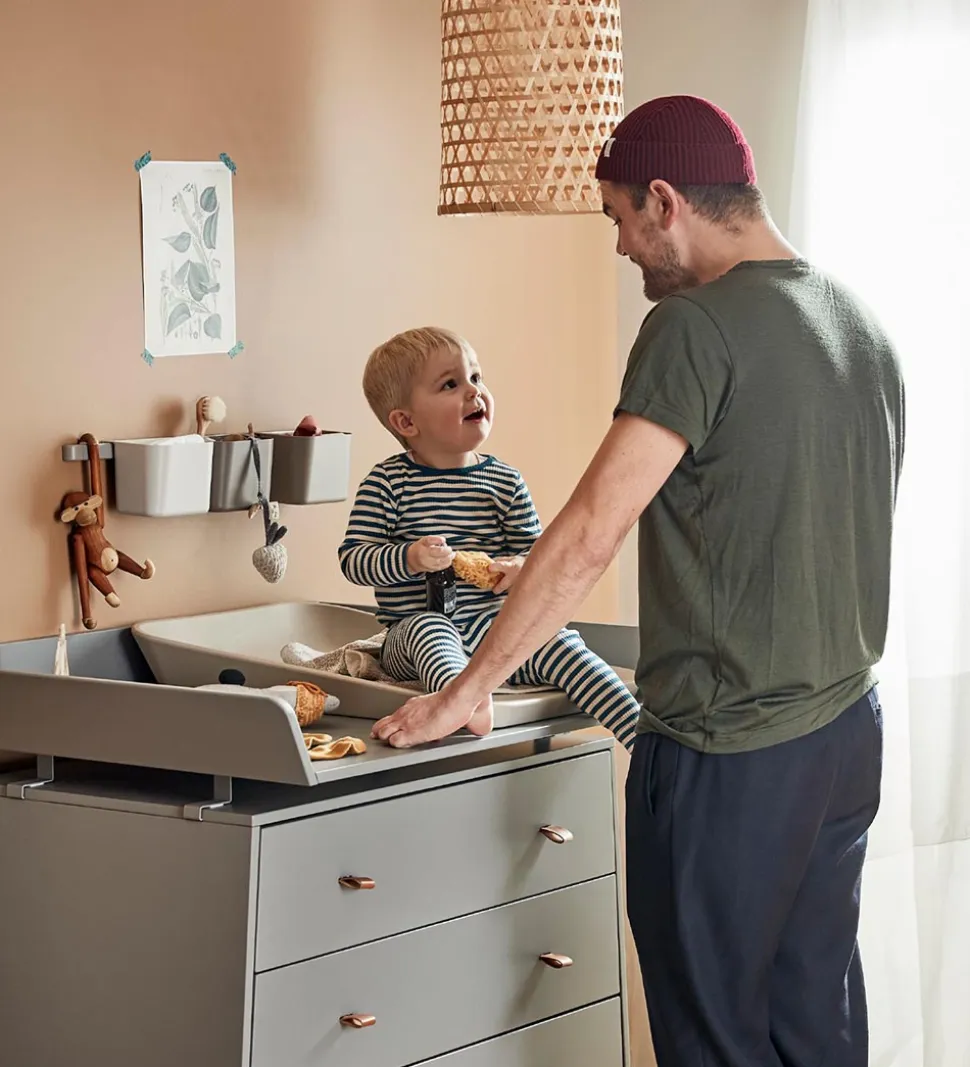 Puslepuden har høje kanter, som sørger for, at babyen ikke triller ned. Undersiden af puden er lavet af træ, som giver en god stabilitet, og der er små gummidutter under, så puslepuden bliver liggende, hvor den skal.
