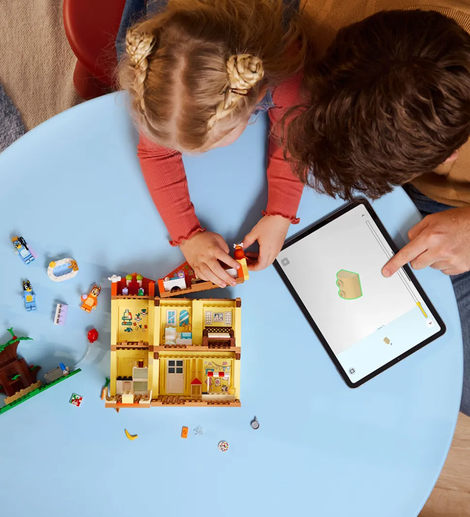 LEGO® Bluey sættet giver mulighed for at bygge et farverigt hus i to etager med detaljerede rum som køkken, stue, badeværelse og soveværelser. Udenfor er der et stort træ og ekstra elementer, der fuldender miljøet omkring huset.