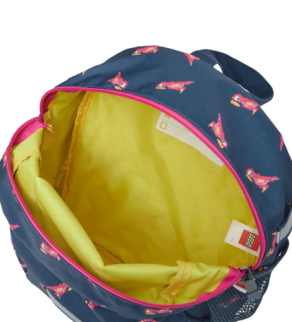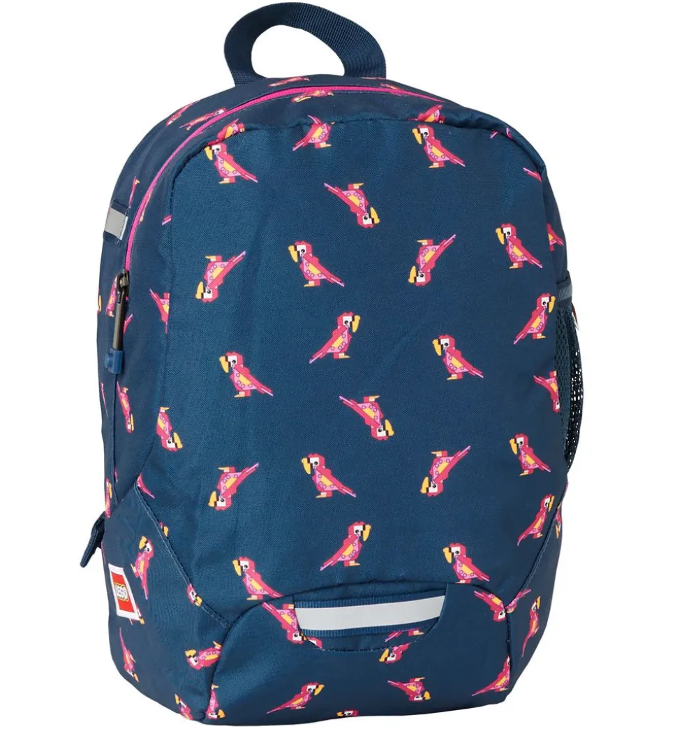 Smart LEGO® børnehavetaske i blå, med små papegøjer i rosa og gule nuancer over det hele.