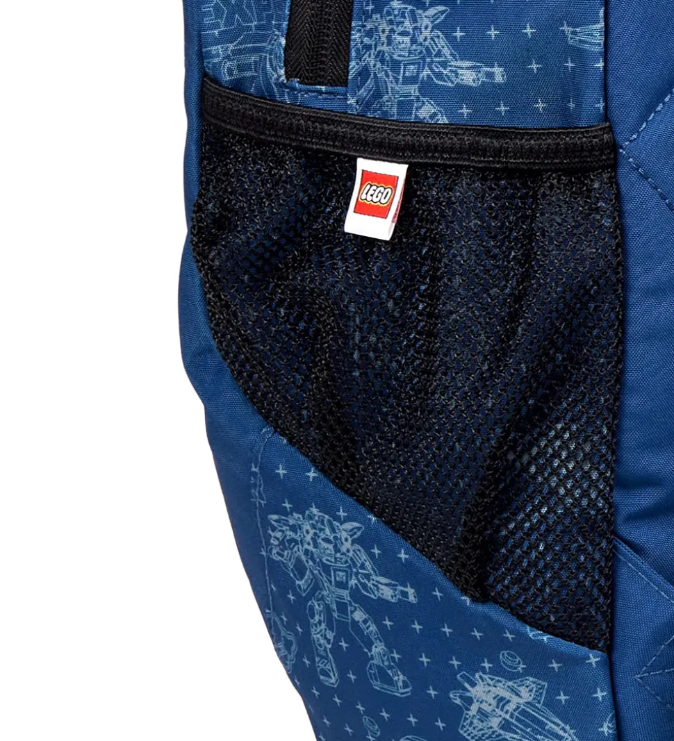 LEGO® børnehavetasken består af ét stort rum, som åbnes i toppen med en lynlås. I den ene side har tasken en åben stiklomme i mesh til f.eks. en drikkedunk eller andre småting.