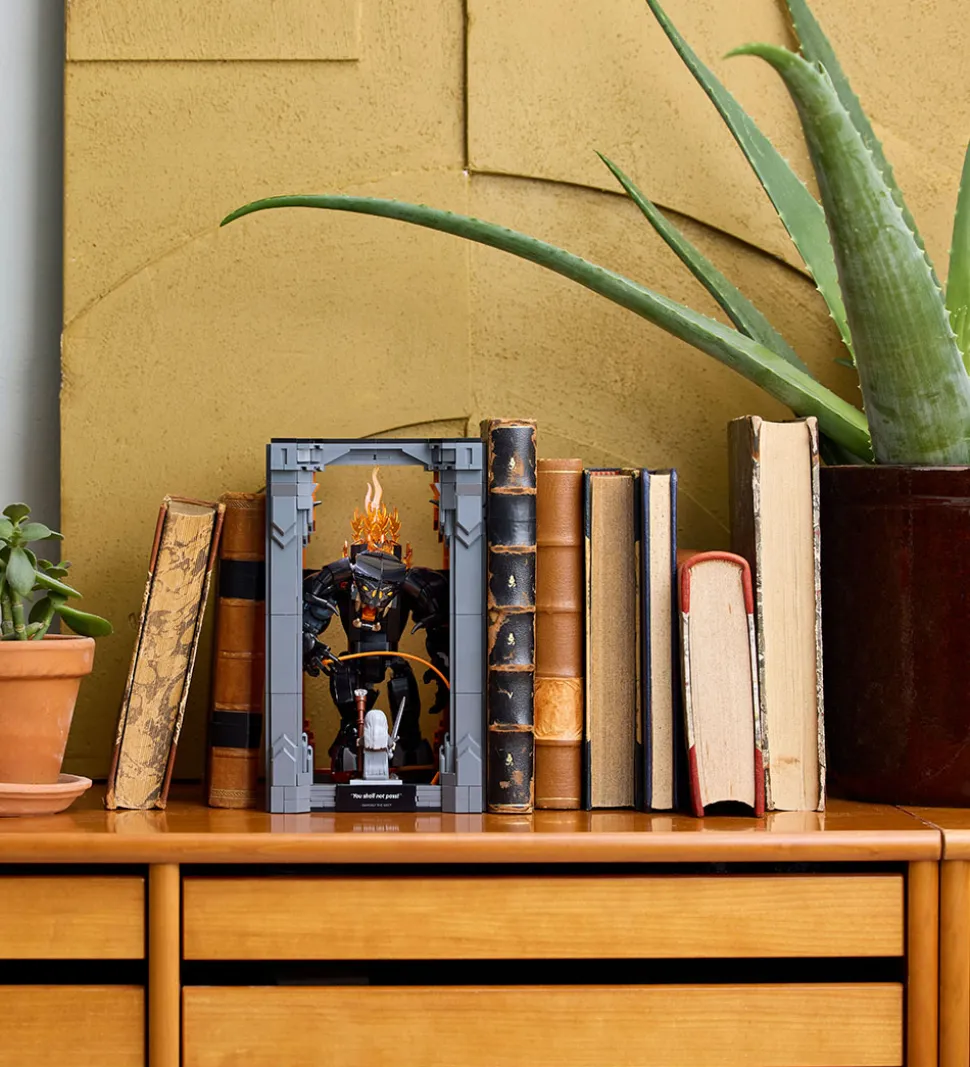 Flot LEGO® Icons sæt med 1201 klodser, som kan samles til en detaljeret bogniche-model med baloggen og Gandalf fra Ringenes Herre-universet.