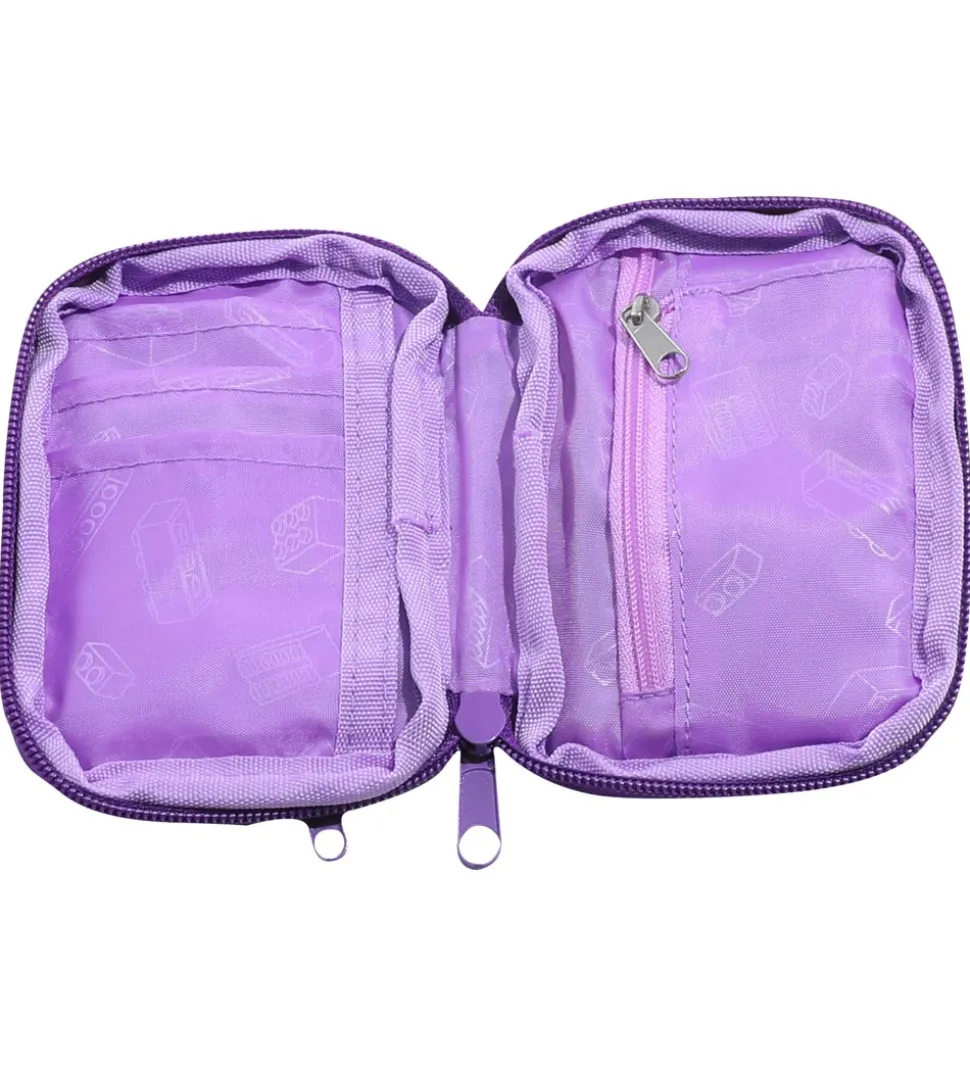 LEGO® Friends pungen består af ét rum, der lukkes med en lynlås. Inden i tasken er der lommer til fire kreditkort og en lomme med lynlås til småpenge. På pungens forside er der en lynlåslomme, og på pungens bagside er der en plastlomme til rejse- eller buskortet.