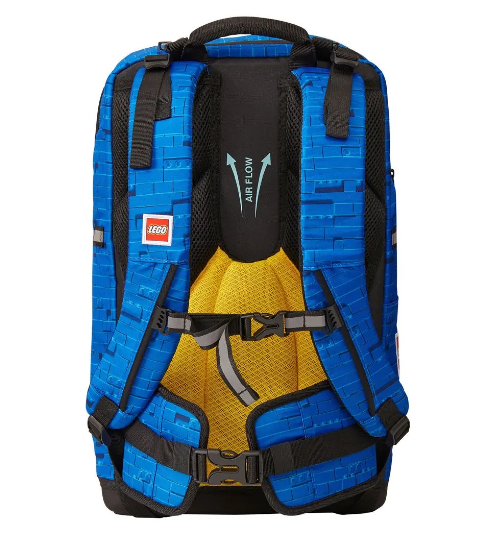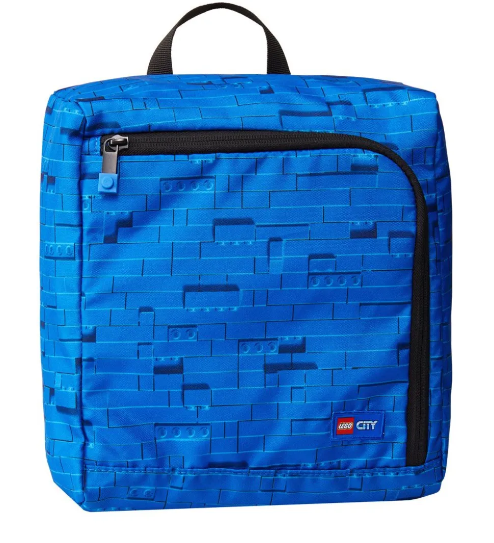 Smart LEGO® skoletaske i blå, med print af LEGO® klodser så det ligner tasken er bygget af LEGO® over det hele. Fortil er der et stort print af en figur i toppen.