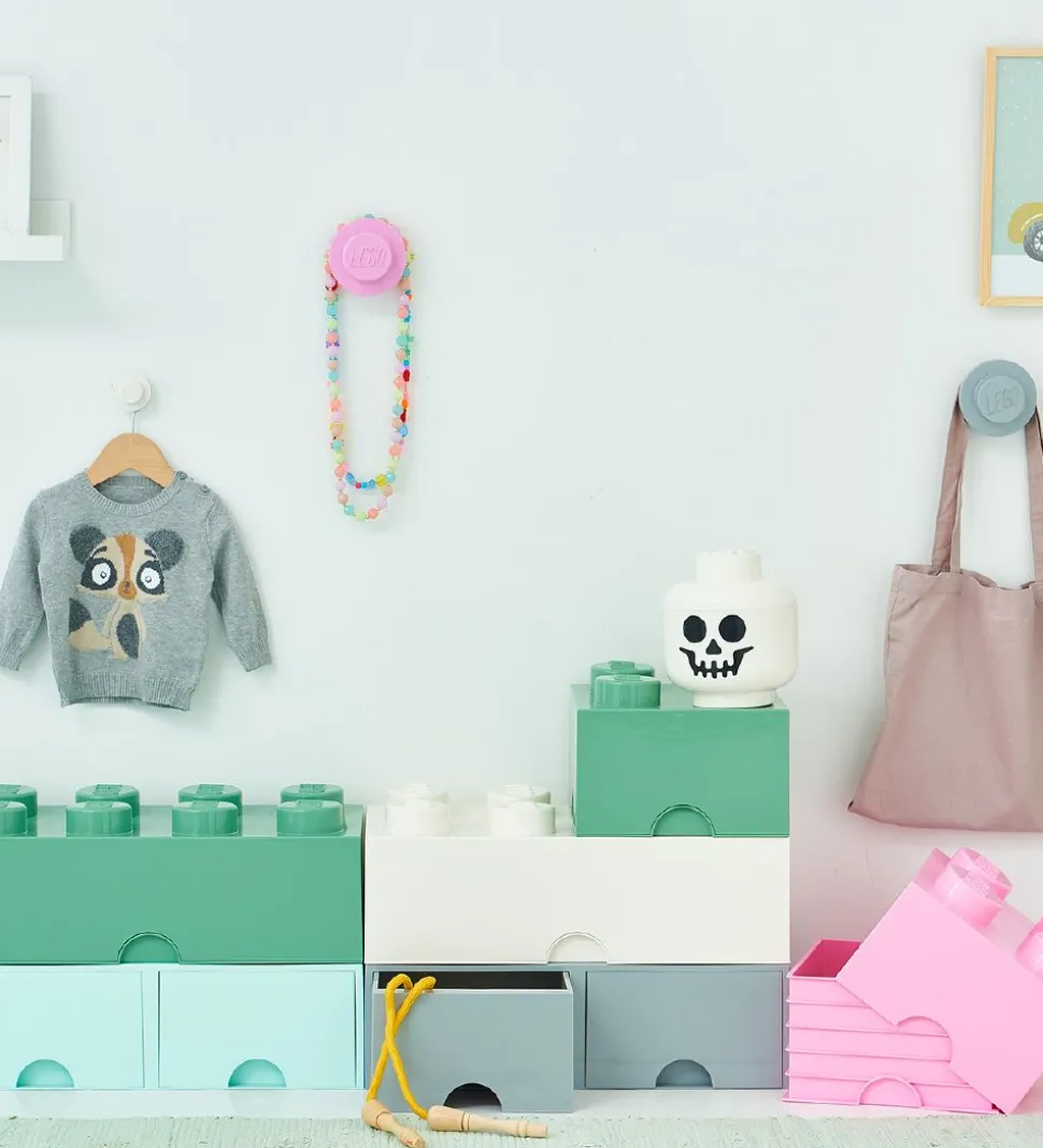 LEGO® Storage knagerækkesættet er både dekorative og praktiske, der kan både hænges jakker, trøjer og bøjler på knagerne. Knagerne er lette og hænge op på væggen, som man ønsker.