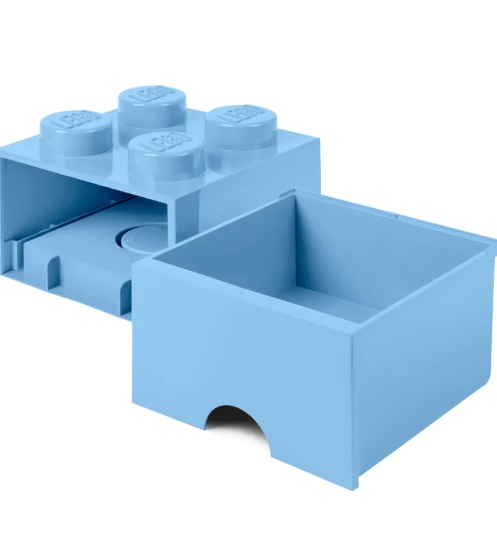 Praktisk LEGO® Storage skuffe formet som en LEGO® klods i lyseblå med fire knopper på toppen.