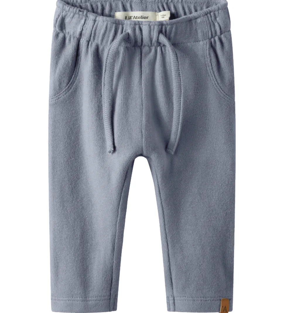 Behagelige bukser fra Lil Atelier i lyseblå strik. Bukserne har en elastisk talje, som kan justeres med knapper indvendigt. De har dekorative snører foran og en afslappet pasform.