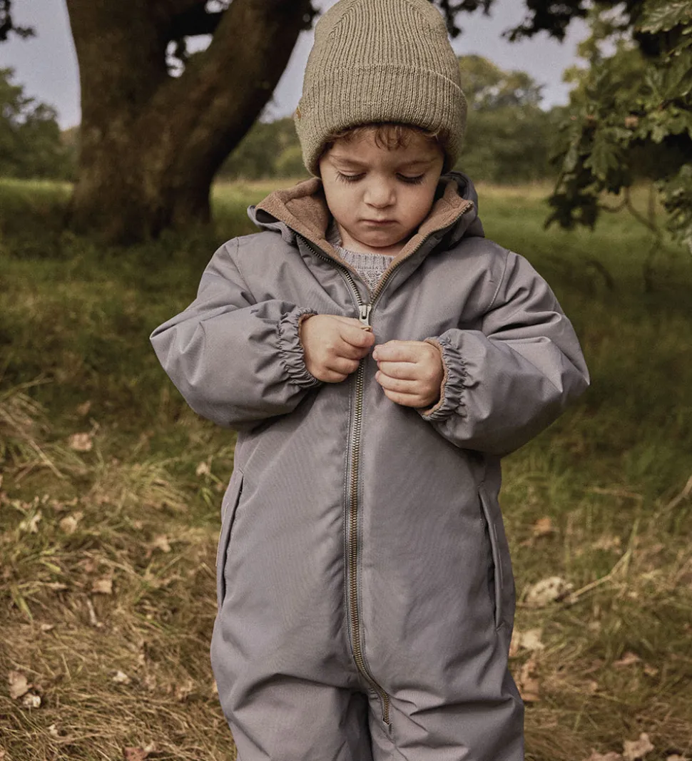 Lil’ Atelier flyverdragten har en aftagelig hætte med trykknapper, og en skjult elastikkant med fleece-for i åbningen, så den sidder tæt om ansigtet. Flyverdragten har en lynlåsåbning med en indvendig vindstolpe. Flyverdragten har et blødt fleece-for i kroppen, og den er lunt vatteret.