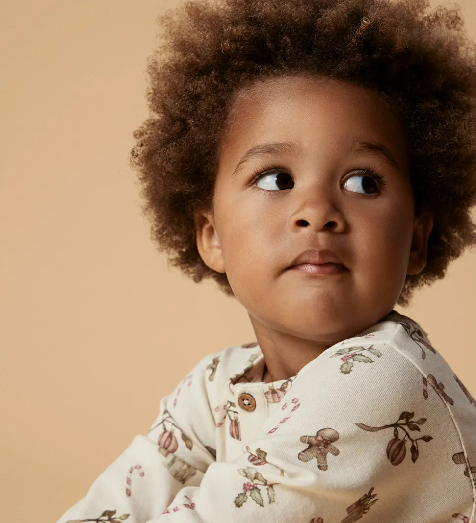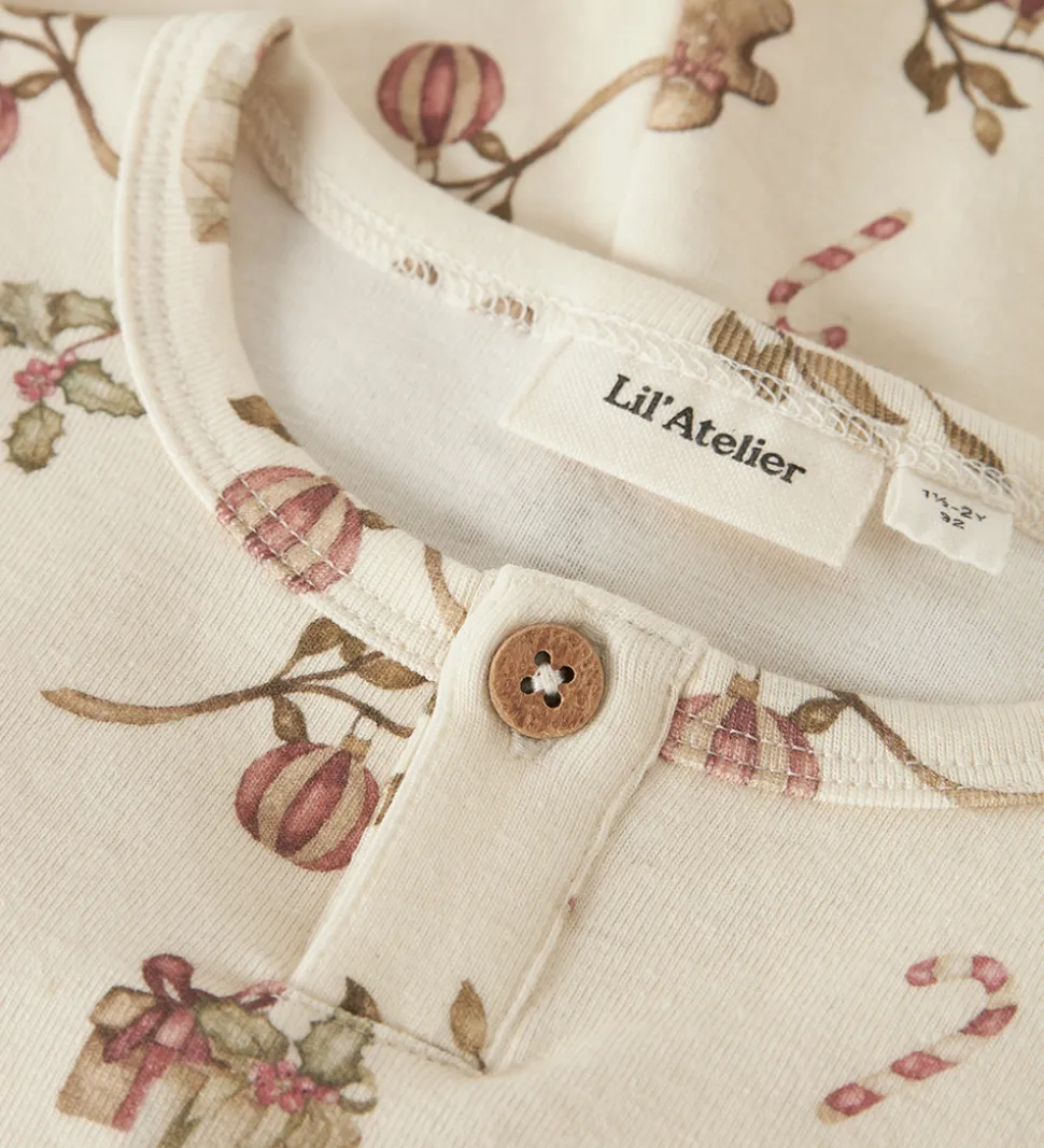 Charmerende Lil Atelier nattøj, bestående af en natbluse og et par natbukser i beige med et sødt print af peberkagemænd og juleelementer. Natblusen har lange ærmer, mens natbukserne har en elastisk talje, som sikrer en god pasform. Perfekt til hyggelige nætter.