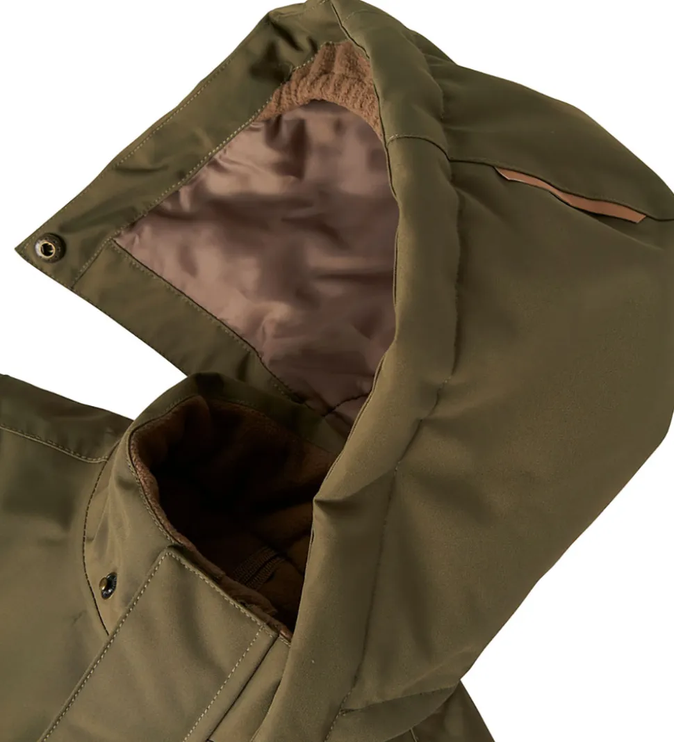 Lil’ Atelier vinterjakken har en aftagelig hætte med trykknapper, og en skjult elastikkant med fleece-for i åbningen, så den sidder tæt om ansigtet. Flyverdragten har en lynlåsåbning med dobbelt vindstolpe, som lukkes til med velcro. Vinterjakken har et blødt fleece-for i kroppen, og den er lunt vatteret.