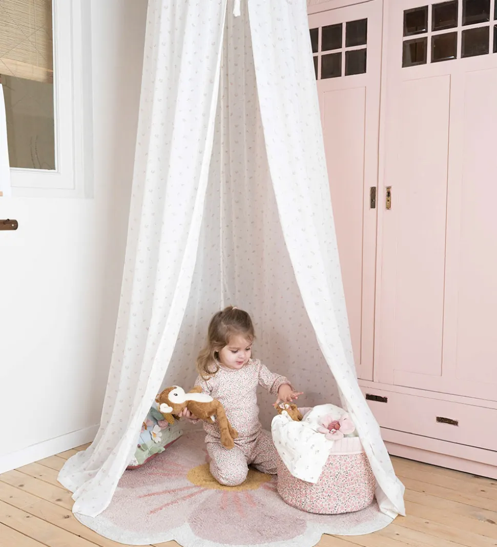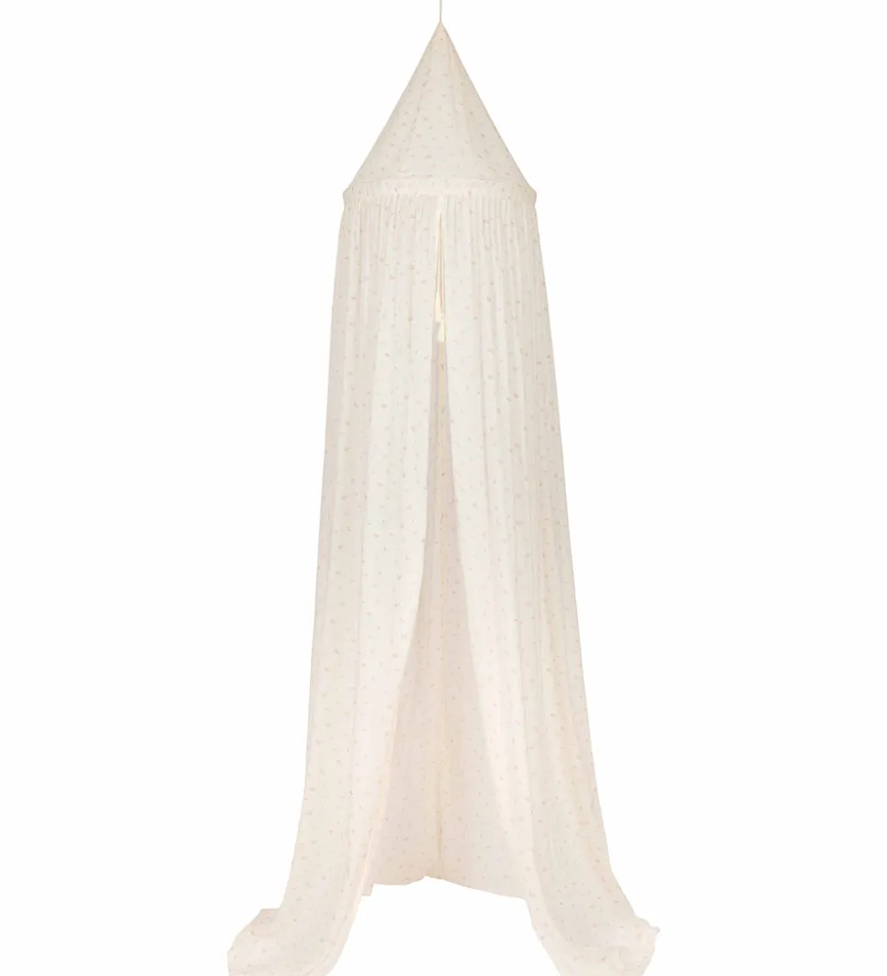 Charmerende Little Dutch sengehimmel i cremehvid musselin med et print af rosafarvet blomster.