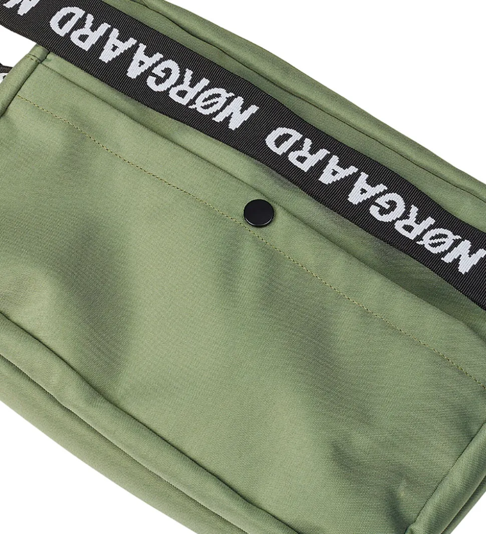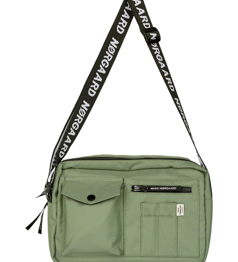 Flot Mads Nørgaard skuldertaske i armygrøn med en sort skulderstrop med logoprint i hvid.