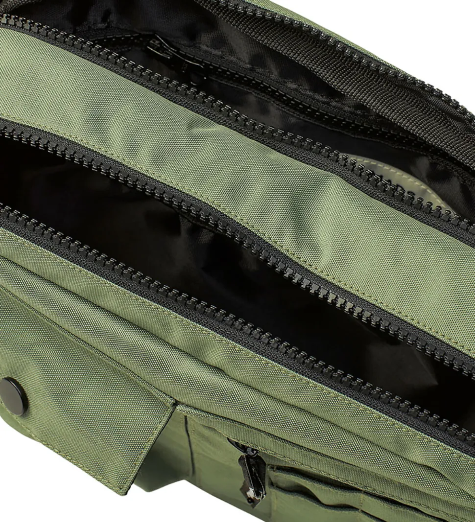 På ydersiden er der en rummelig klaplomme som lukkes med en trykknap på fronten af tasken i venstre side. I højre side er der en sort lynlåslomme og nedenunder er der fire smalle, åbne lommer. Bagpå skuldertasken er der en bred lomme med en trykknap i toppen. I toppen er der en bred, justerbar skulderstrop.