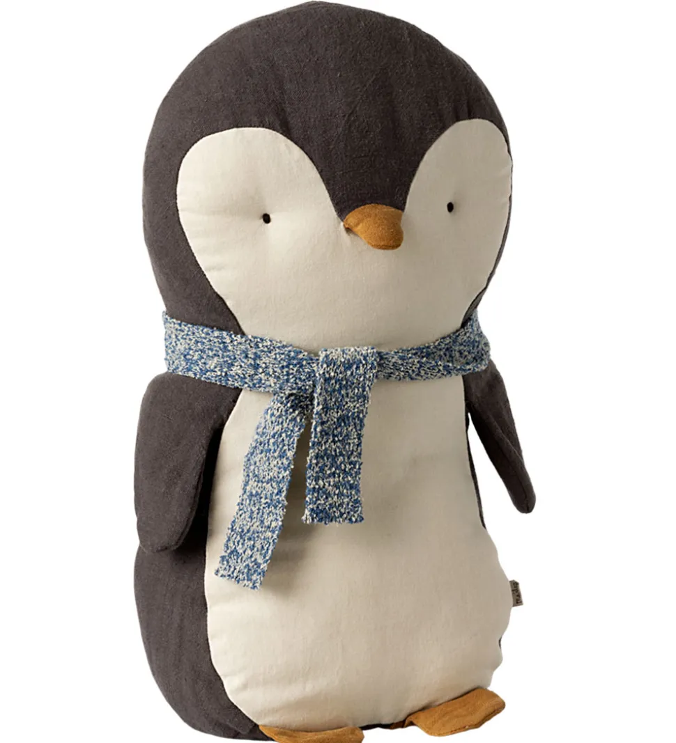 Sød Maileg bamse i form af en pingvin i mørkegrå og hvid med et orange næb og fødder og med et strikket tørklæde omkring halsen i blå og hvid.