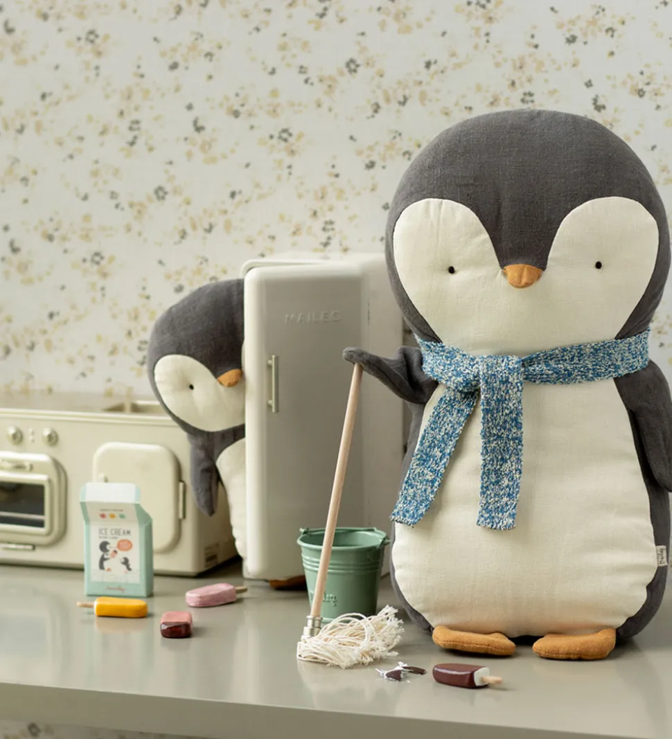 Maileg pingvinen har PP piller i bagdelen, som giver den tyngde og gør at den kan stå oprejst. Det søde design bringer en hyggelig stemning til børneværelset eller et andet rum i hjemmet.