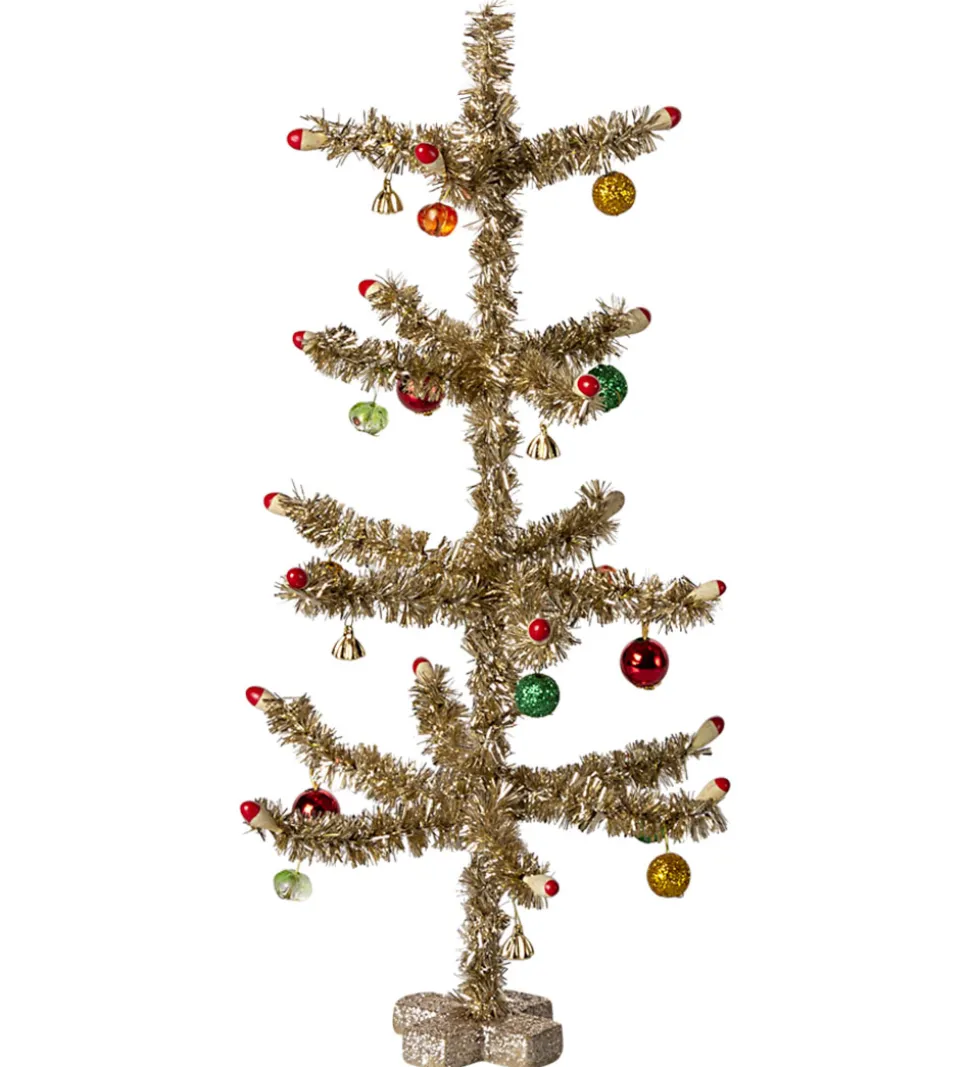 Festligt Maileg juletræ i guld med grønne, røde og guld julekugler og andet fint julepynt.