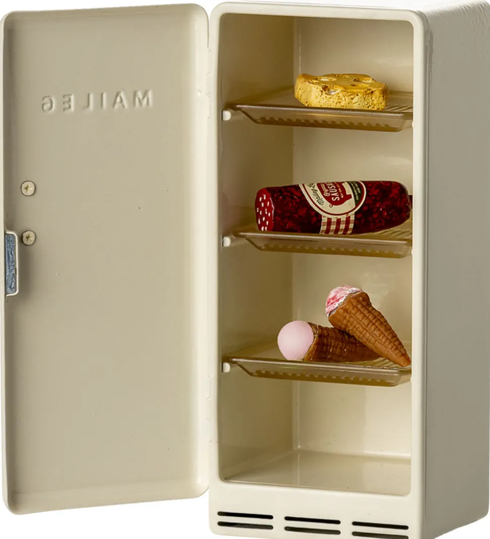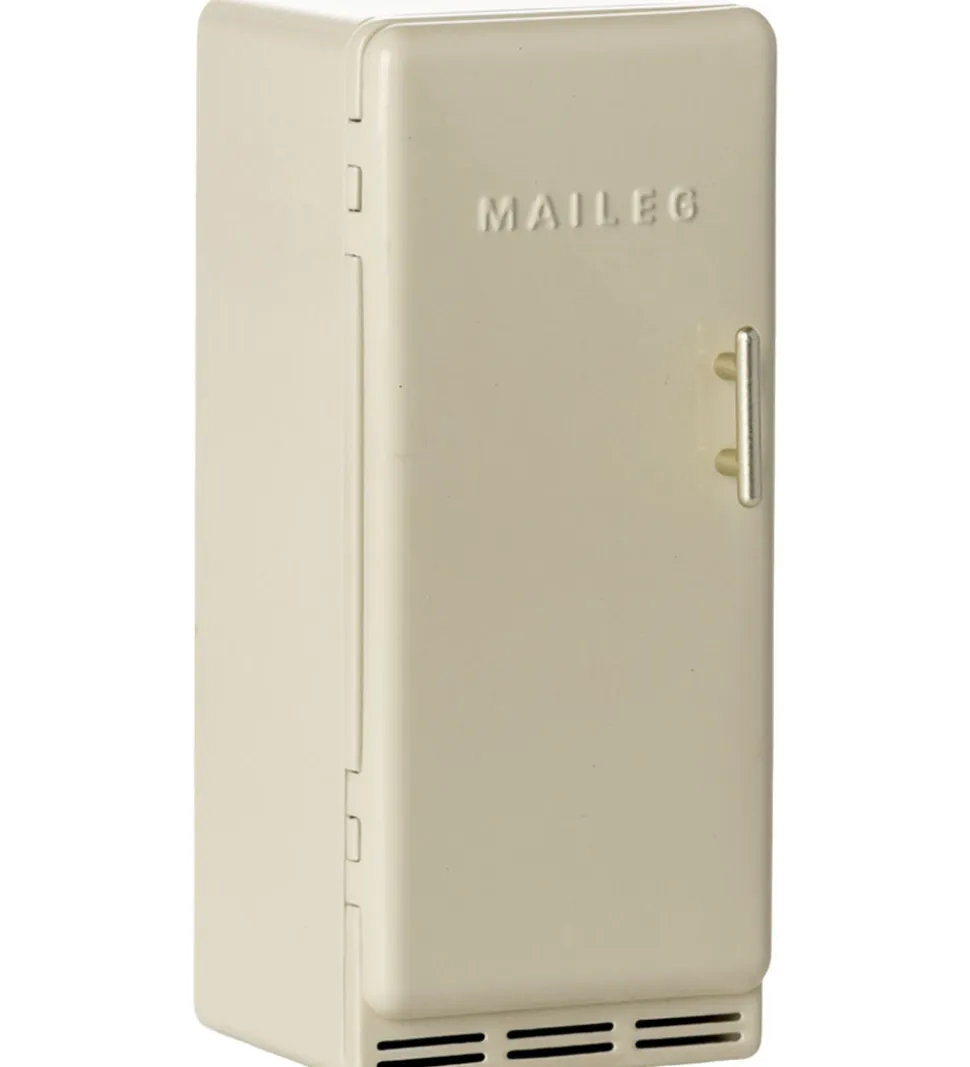 Fint Maileg køleskab i råhvid. Køleskabet er i et vintagedesign og lavet primært af metal.