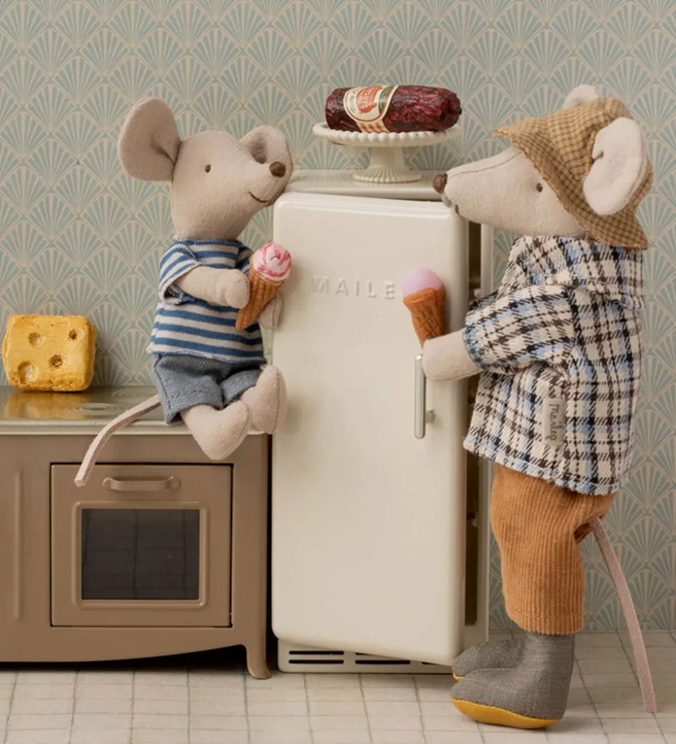 Maileg køleskabet passer til Mailegs legetøj i størrelse musefamilie og gør familielegen komplet. Køleskabet kan åbnes og har tre fylder, og inden i gemmer sig tilbehør i form af ost, pølse og vaffelis. Køleskabet er lavet som tilbehør til Maileg Mouse Hole Bondehus.