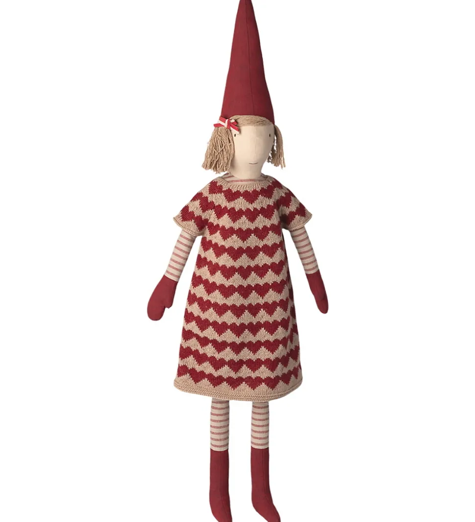 Flot Maileg nissepige iført en strikket kjole med rødt og beige hjerte-mønster, røde handsker og støvler samt en spids, rød nissehuse. Perfekt til at skabe en hyggelig atmosfære.