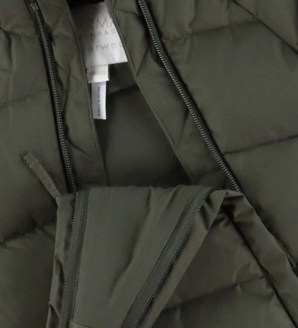 Flyverdragten lukkes fortil med to parallelle lynlåse med dobbelt vindstolpe. Den har elastikkanter ved anklerne og aftagelige futter, som sidder fast med knapper indvendigt. Flyverdragten har en varm vattering af dun og fjer, og indvendigt er der glætvævet for.