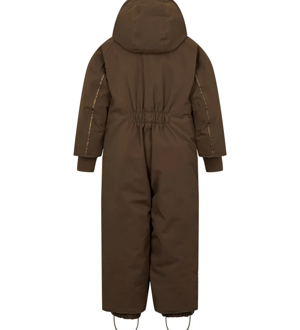 Skøn MarMar flyverdragt i mørkebrun med praktiske refleksdetaljer langs ærmerne og benene.