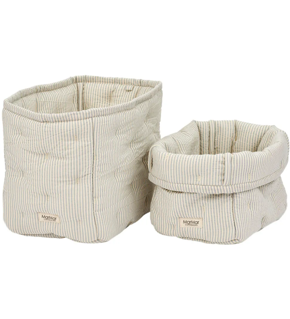 Smarte MarMar kurve solgt i en praktisk 2-pak, i to forskellige størrelser med samme design. Kurvene er i stribet beige og blå med en quilted struktur.