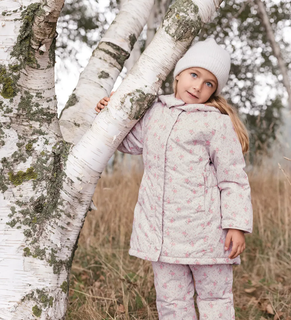 Fin MarMar vinterjakke i lys rosa med blomsterprint i rosa og brun med blå detaljer. Vinterjakken har praktiske refleksdetaljer.